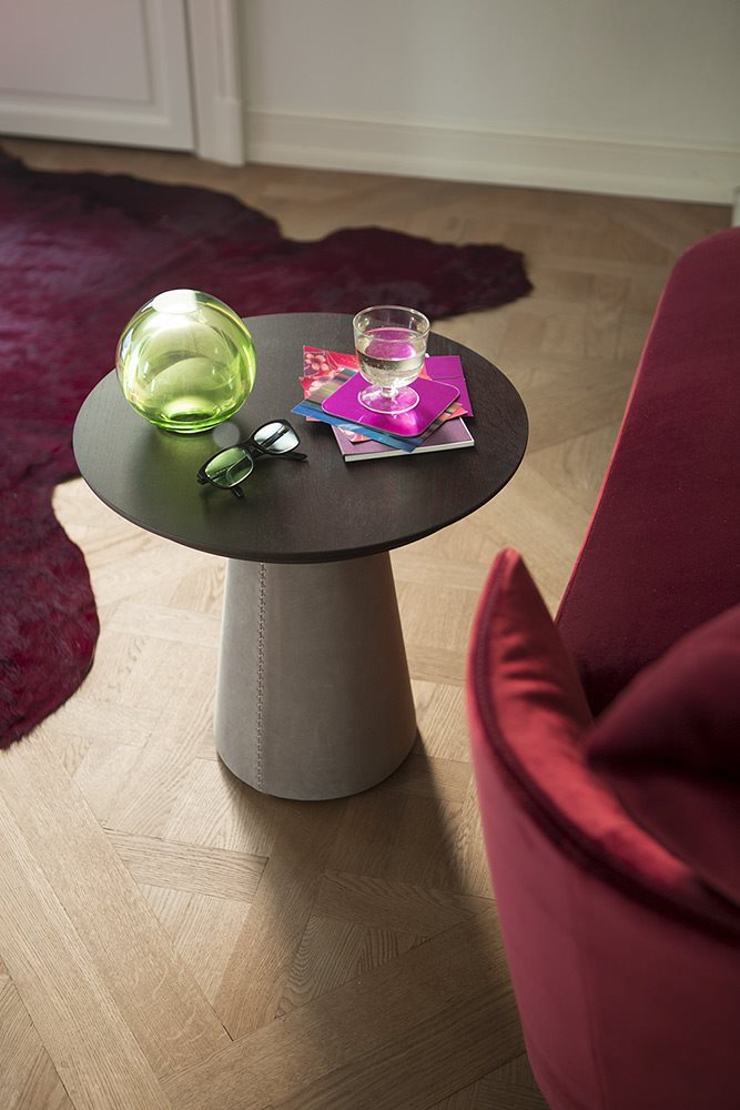 Small tables of two sizes with wood base covered in leather. Top in solid wood-finishing options: WALNUT, DARK OAK.