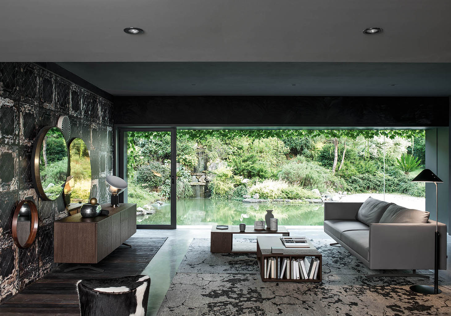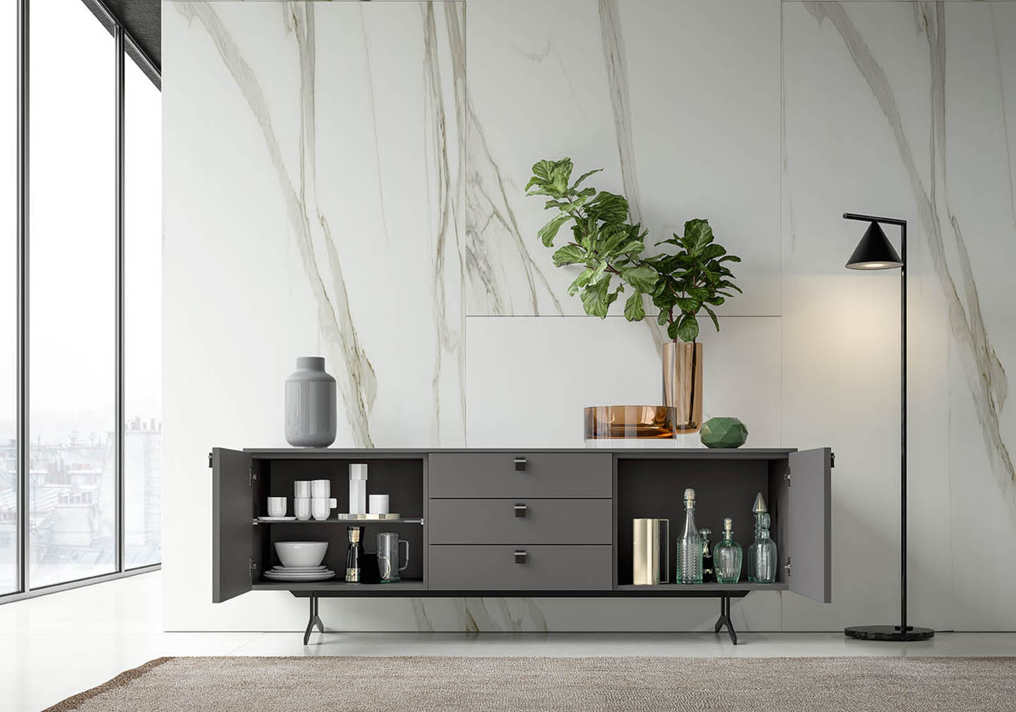 Nobel is available in the sideboard or cabinet version on painted metal feet. It offers a broad range of sizes and options for solutions with doors, drawers and large drawers. Choose your opening mechanism from one featuring push-pull or a leather knob. The design of the metal feet makes this a perfect match with the Oslo modern designer sofa.