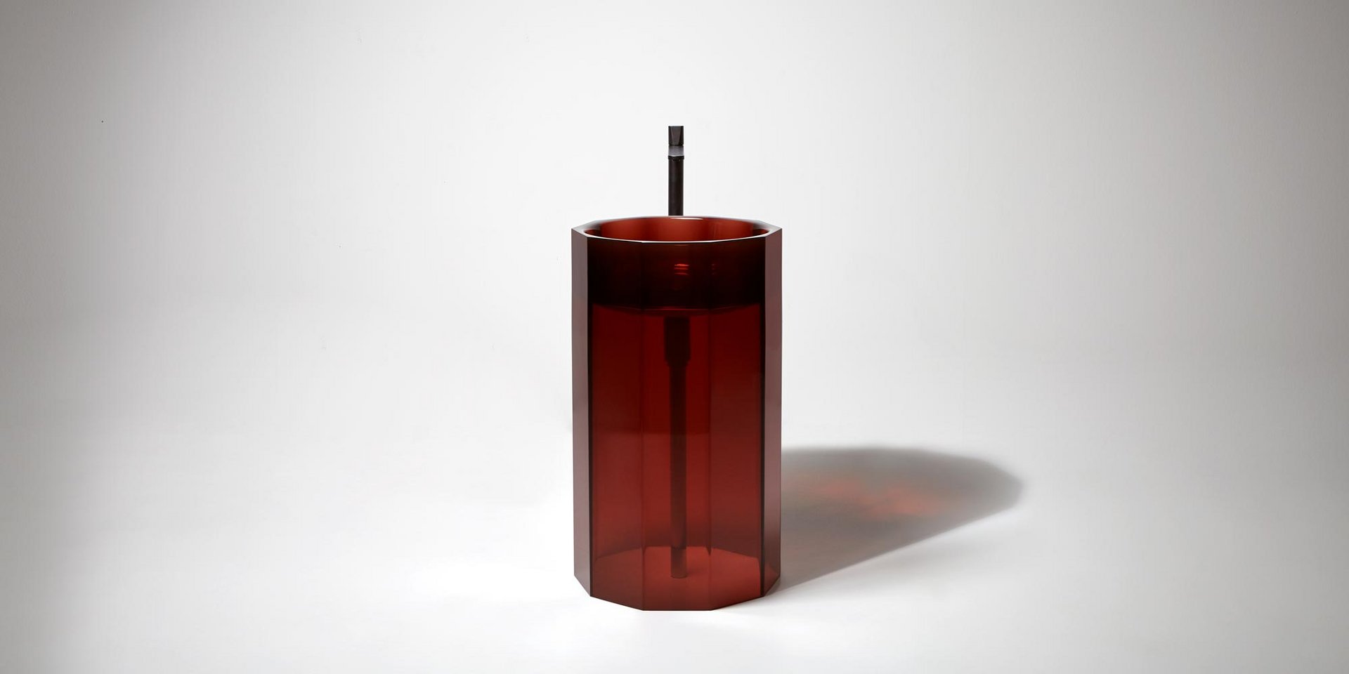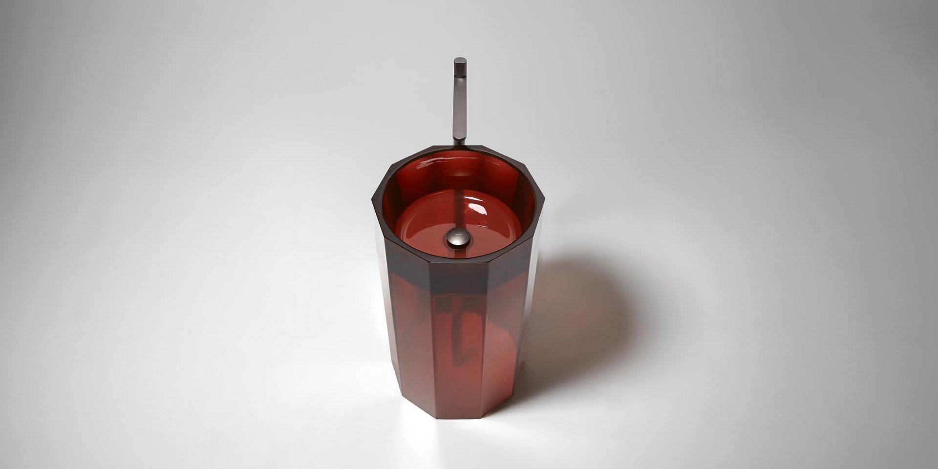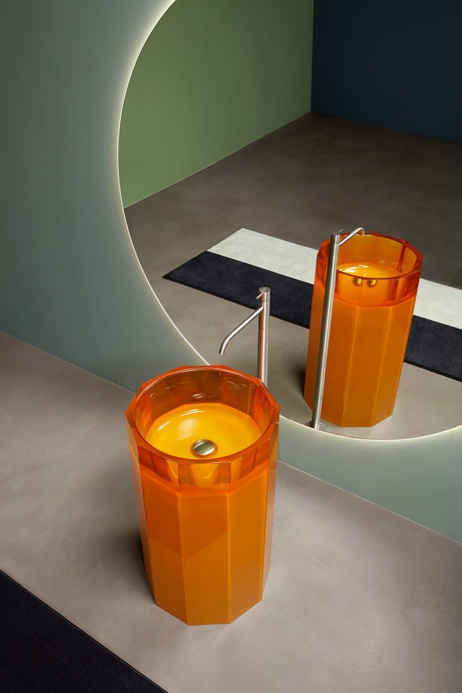 Freestanding Cristalmood sink with floor drainage, available in various colors as per our color chart, complete with pressure plug, siphon and rigid tube.