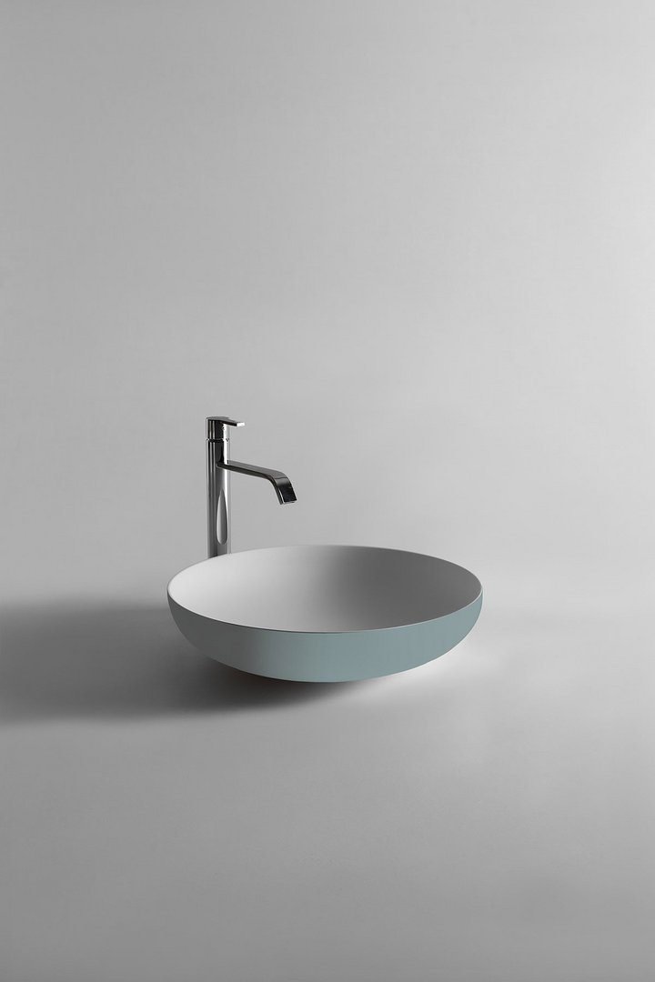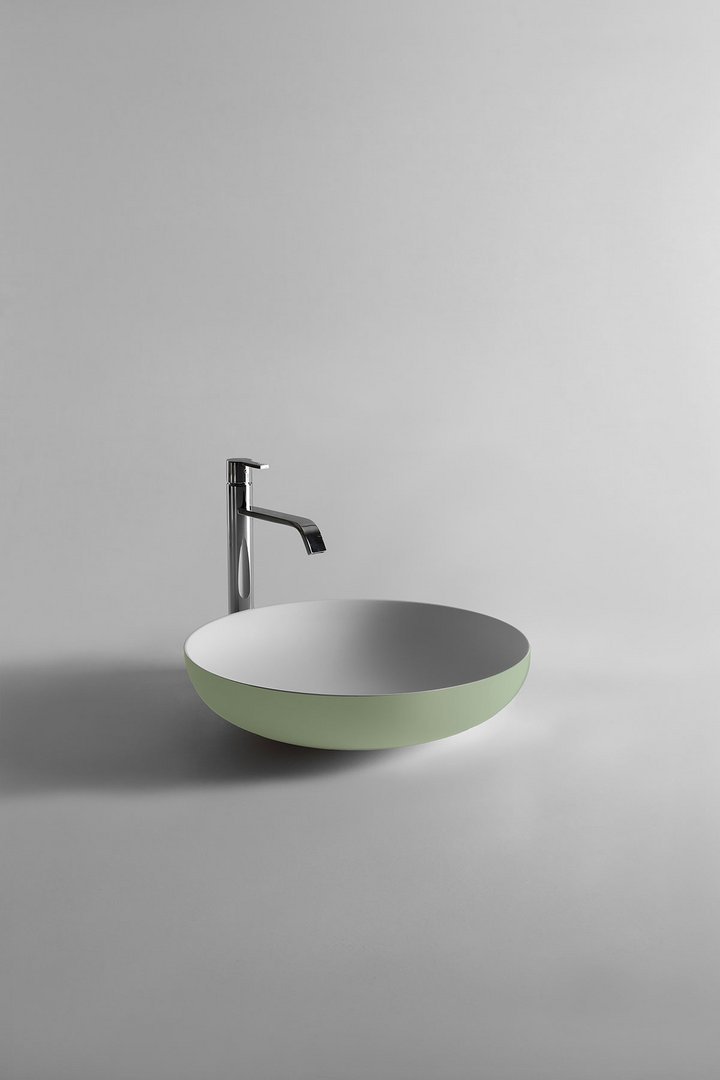 Round top mount Flumood? sink, complete with drain pipe fitting and open plug, that can be lacquered externally.
