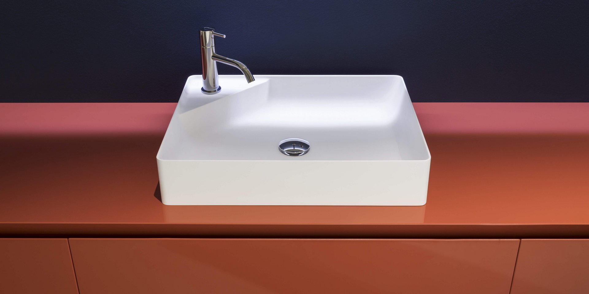 Square top mount Flumood? sink complete with drain pipe fitting and opening plug. Can be lacquered externally.