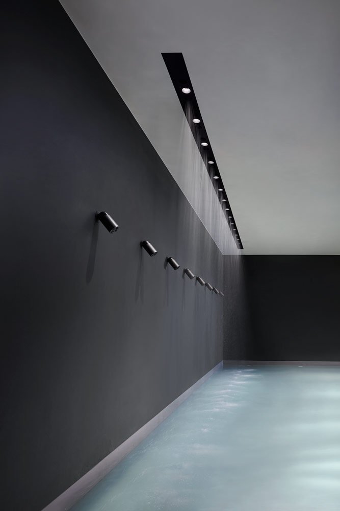 Black Delrin shower with ceiling encasing structure in black aluminum.