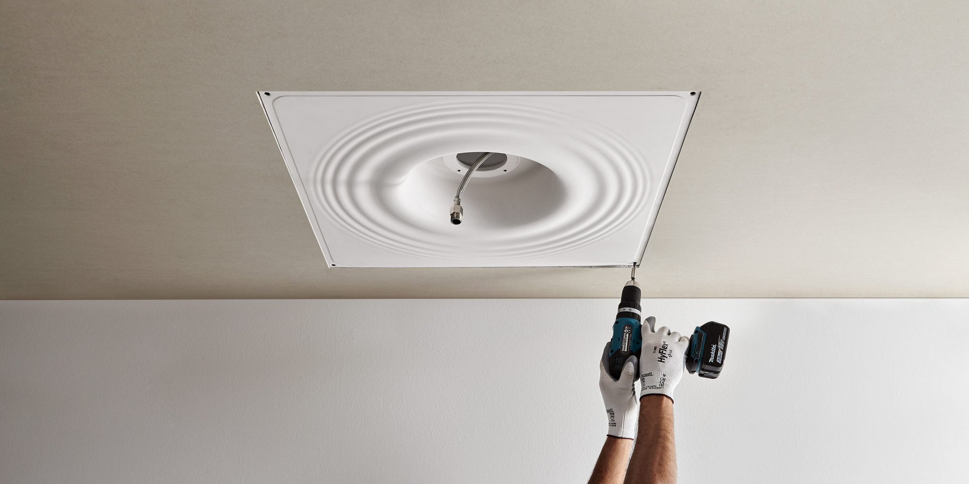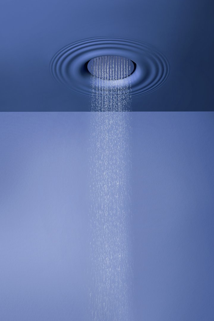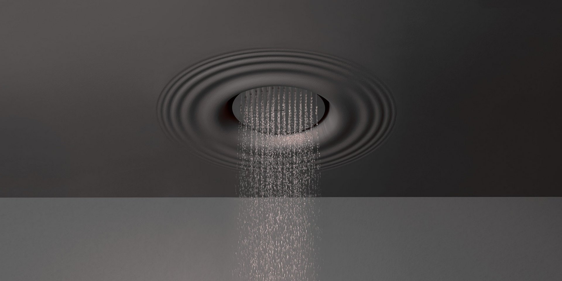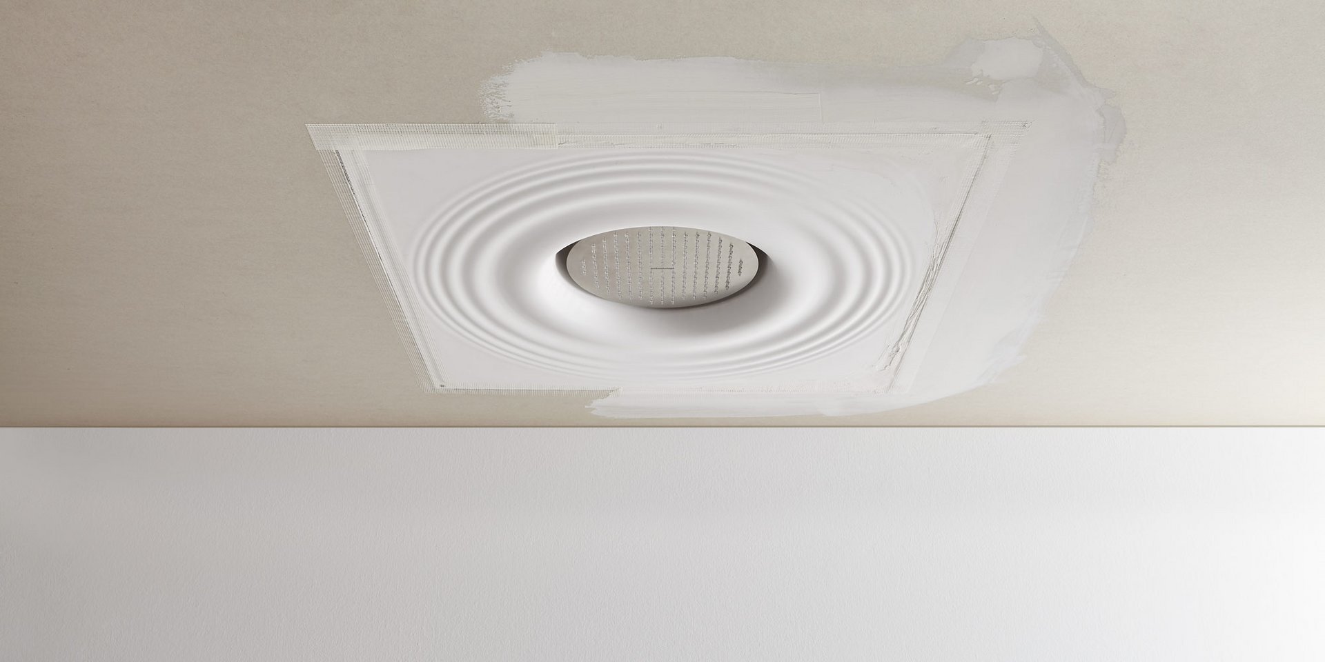 Ceiling encased Flumood frame with satin stainless steel AISI 304 showerhead.