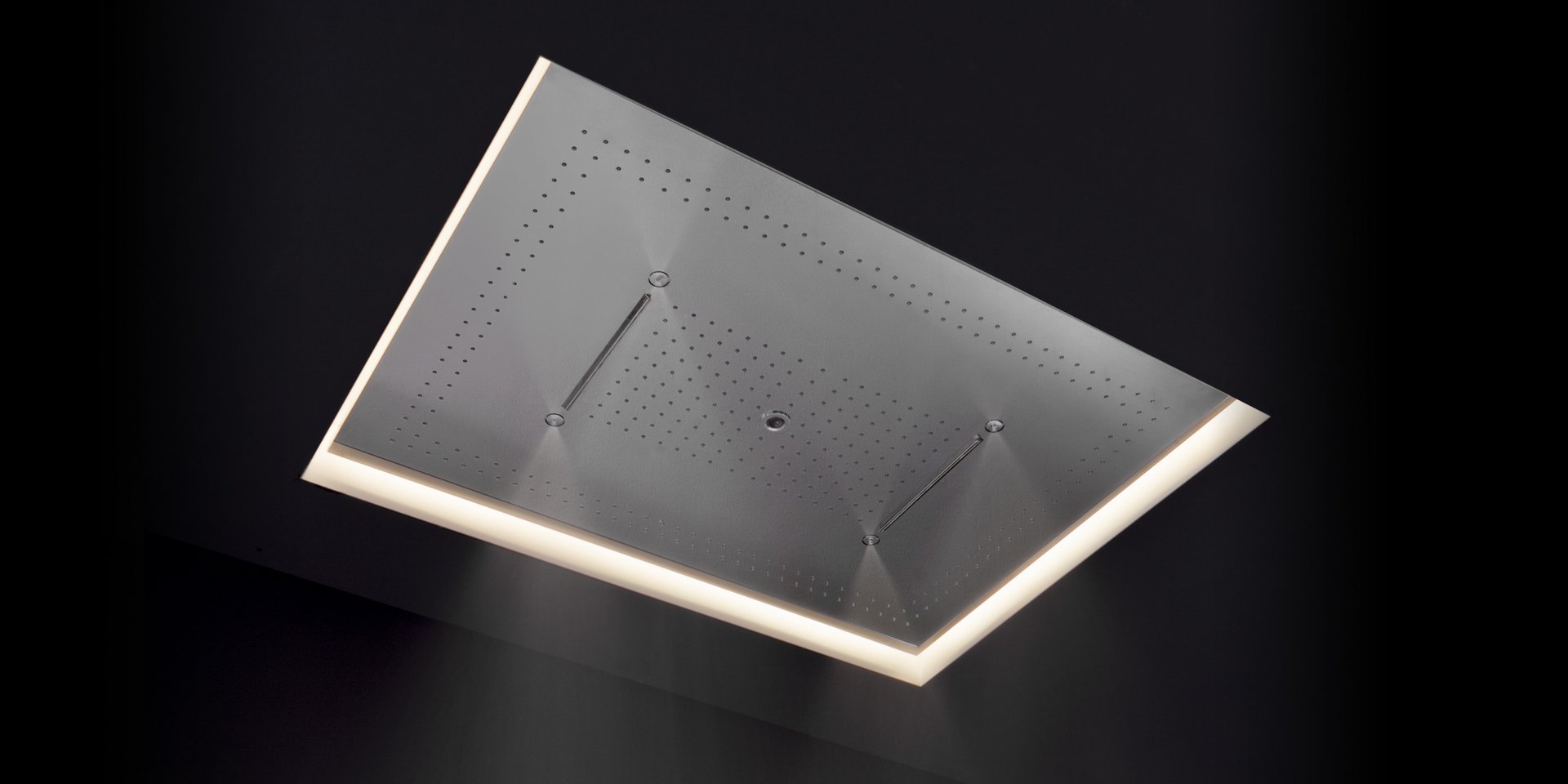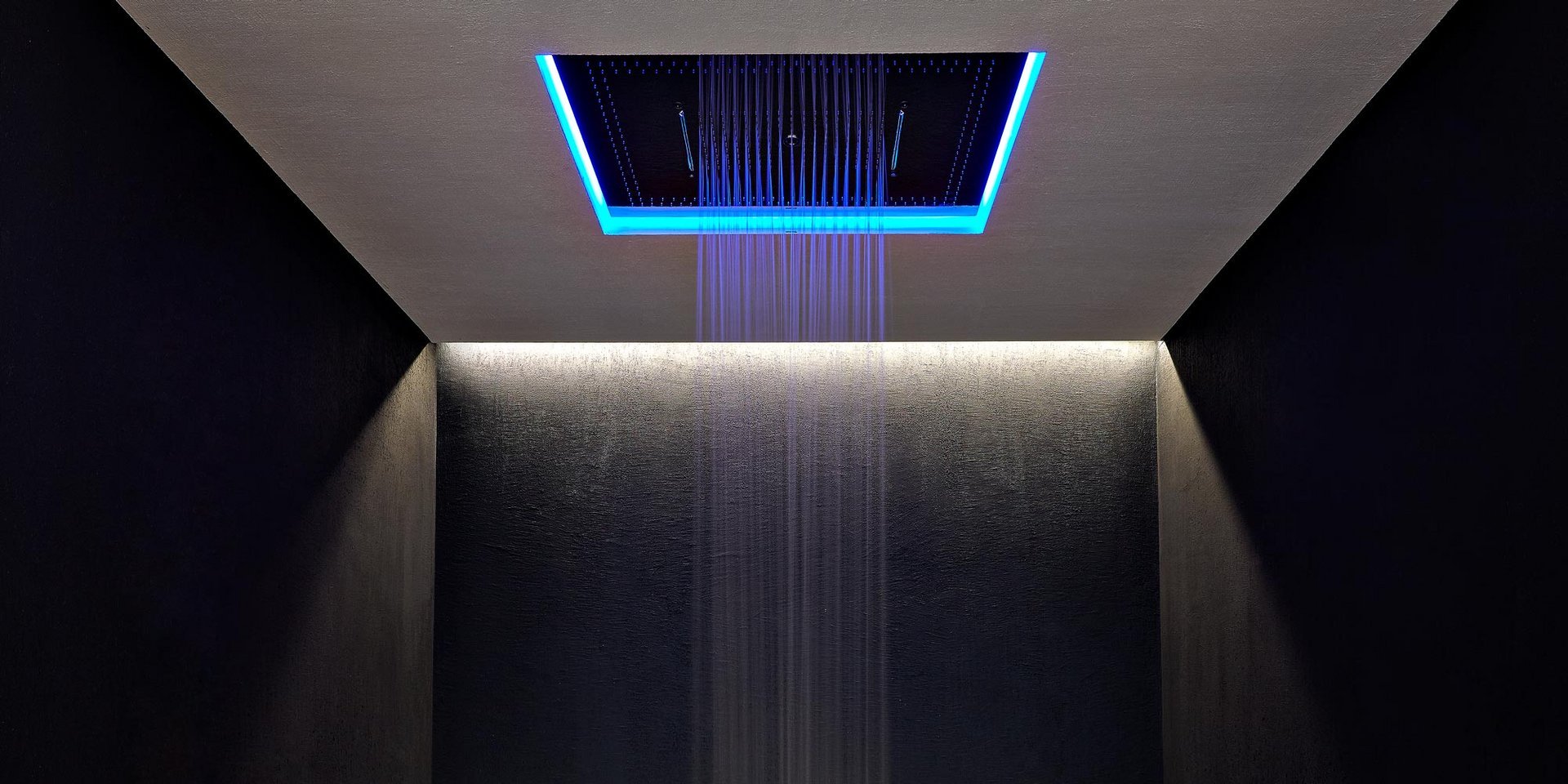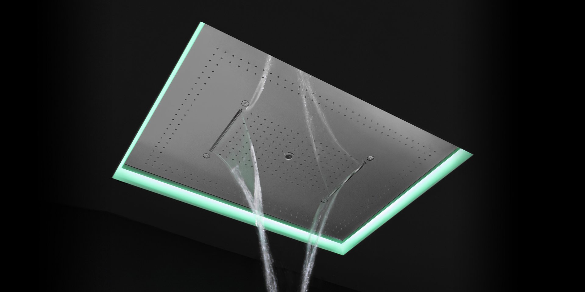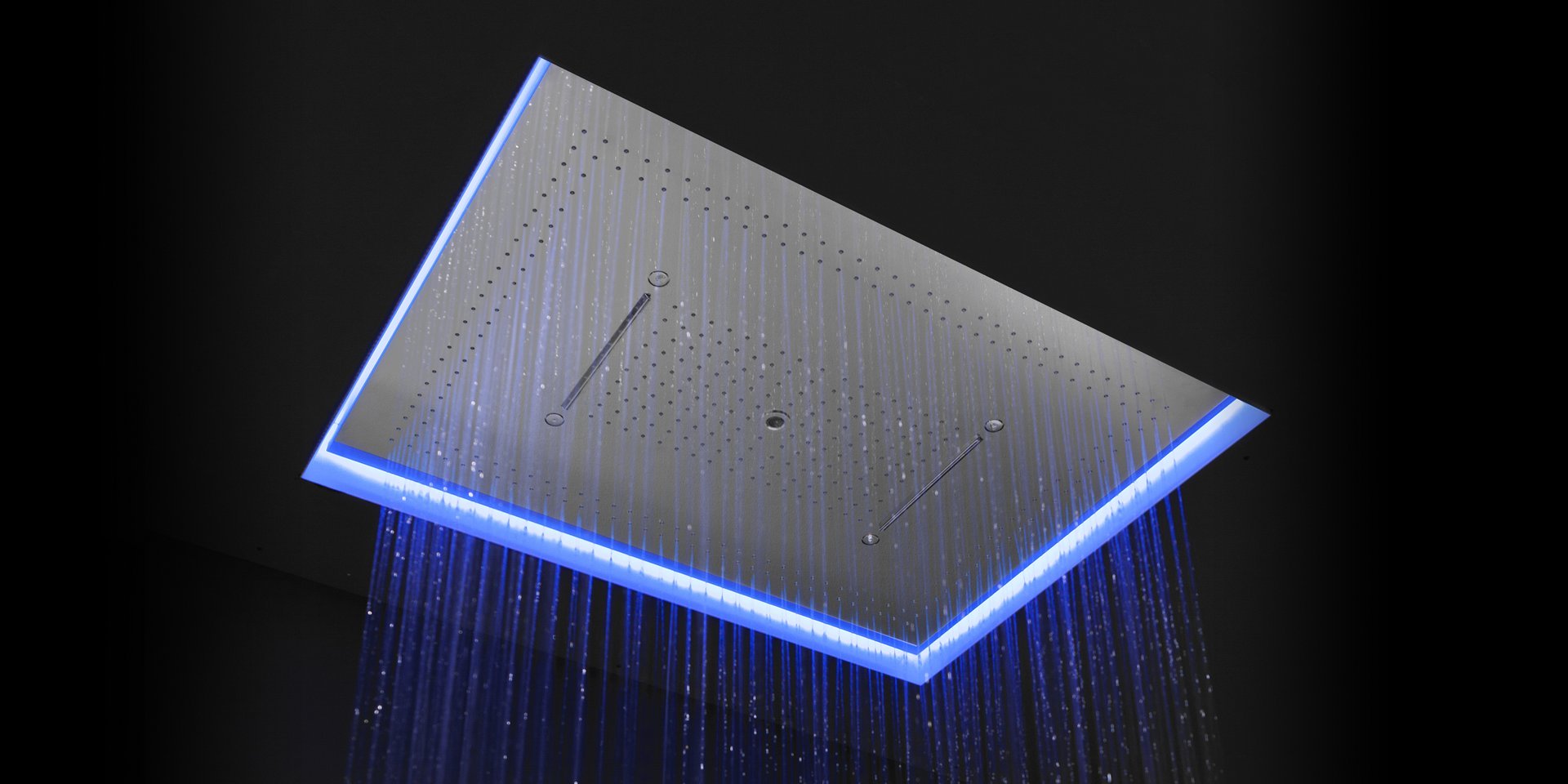 Encased showerhead in polished stainless steel AISI 304 with double waterfall, hard center jet and nebulizers, available in various finishes with possible led rgb lighting complete with waterproof remote control.