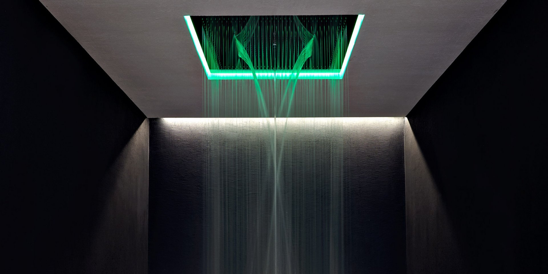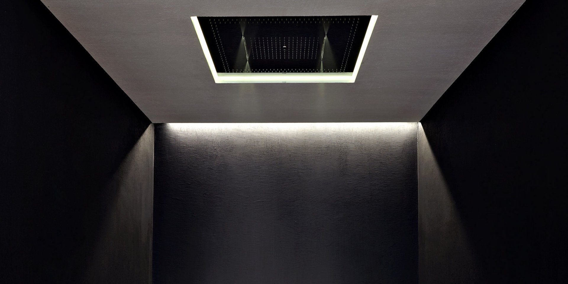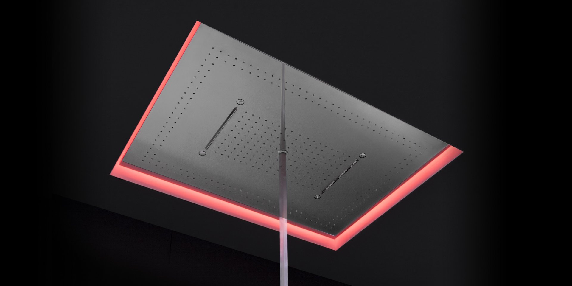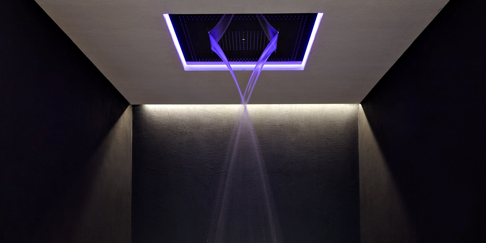 Encased showerhead in polished stainless steel AISI 304 with double waterfall, hard center jet and nebulizers, available in various finishes with possible led rgb lighting complete with waterproof remote control.