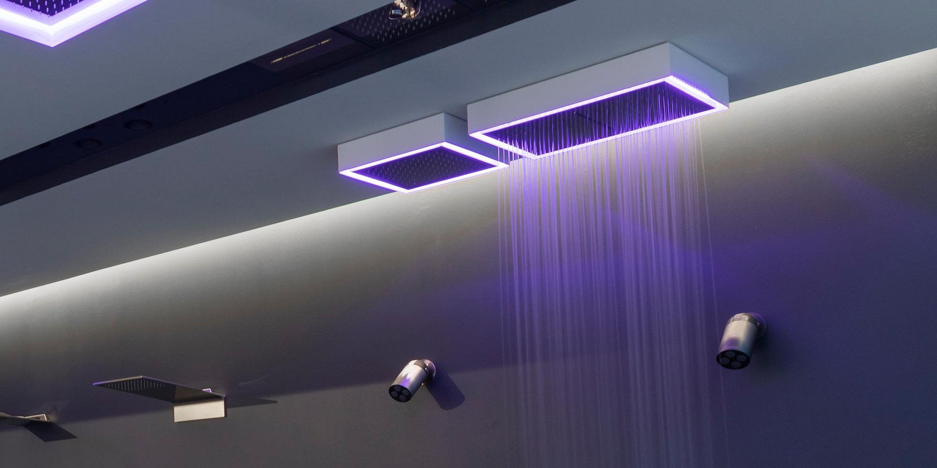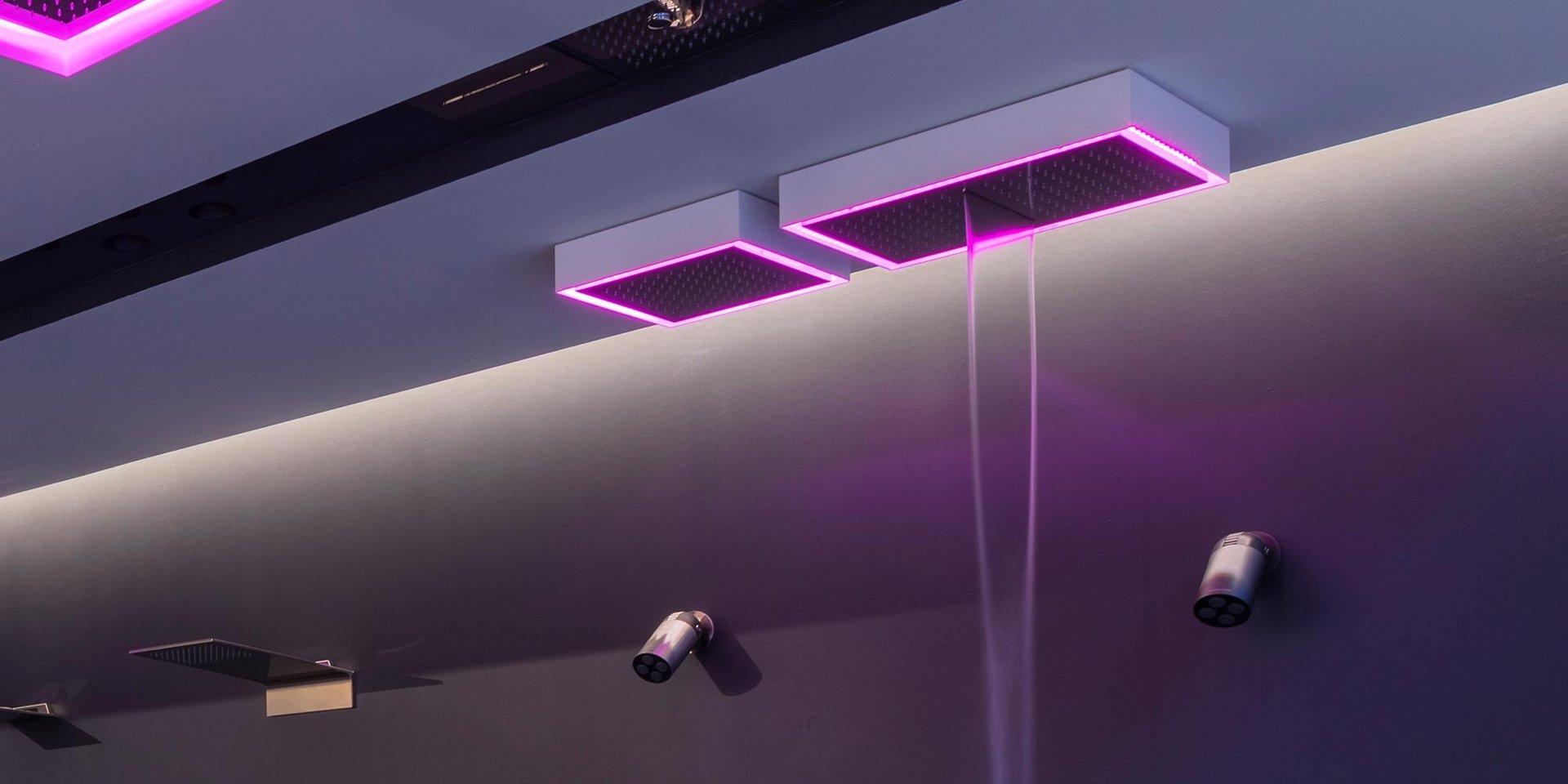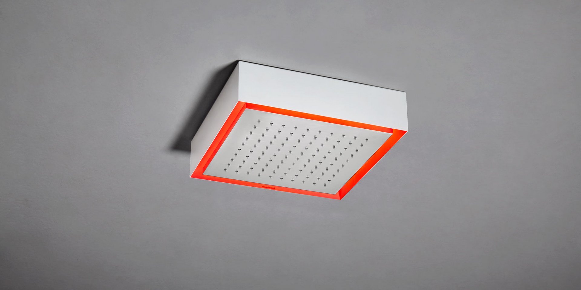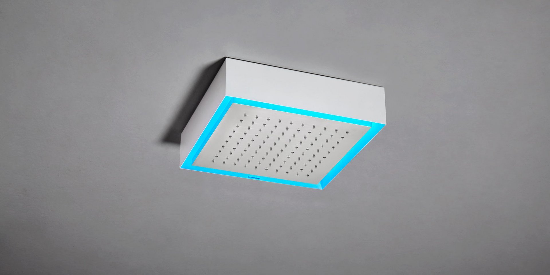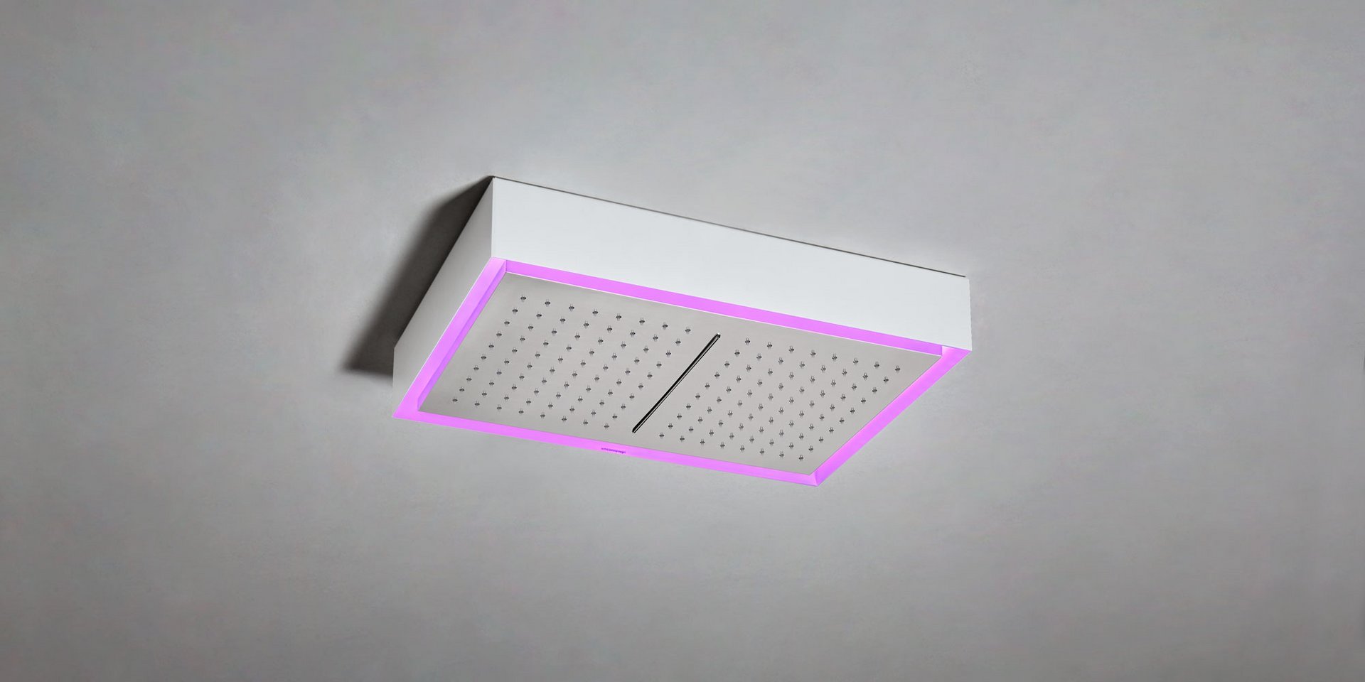Ceiling mounted showerhead with central shower, waterfall and external frame in steel AISI 304, available in various finishes, with possible LED RGB lighting and waterproof remote.