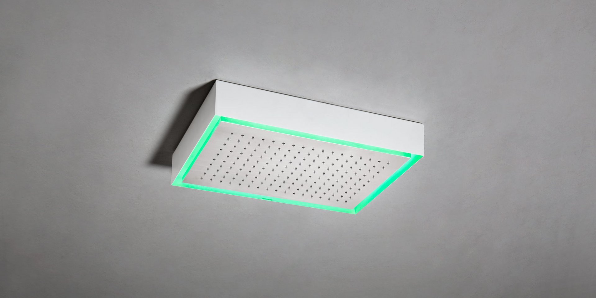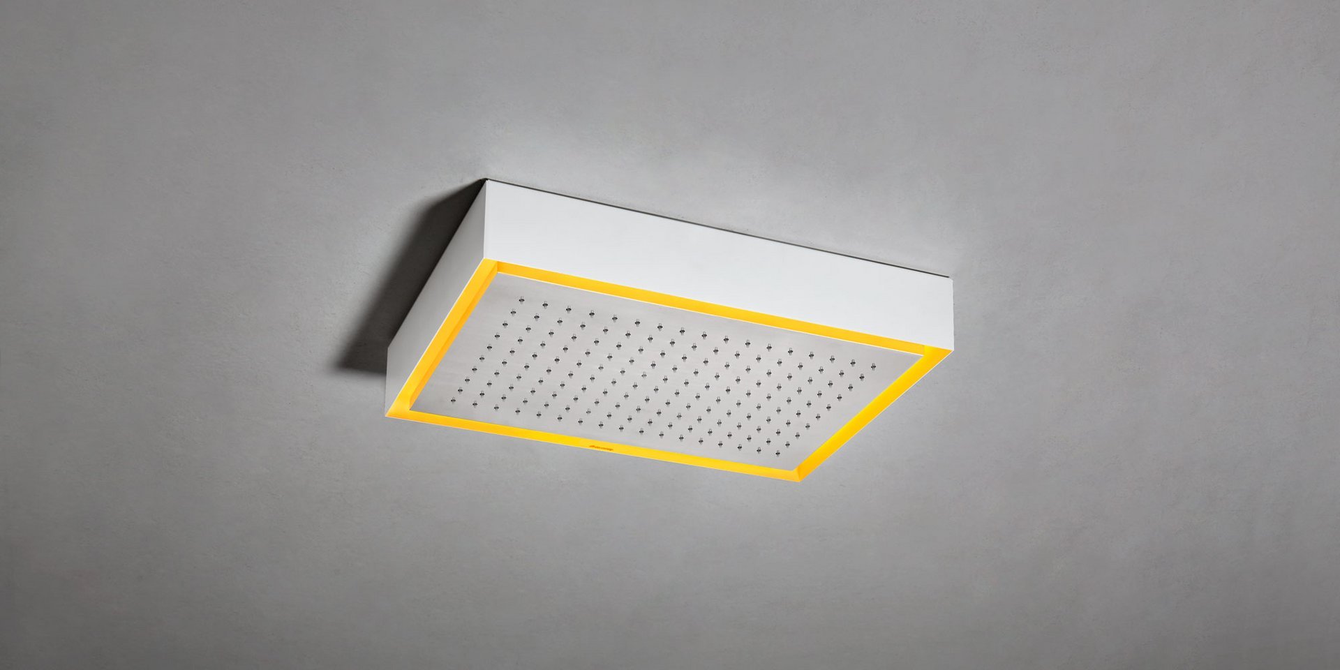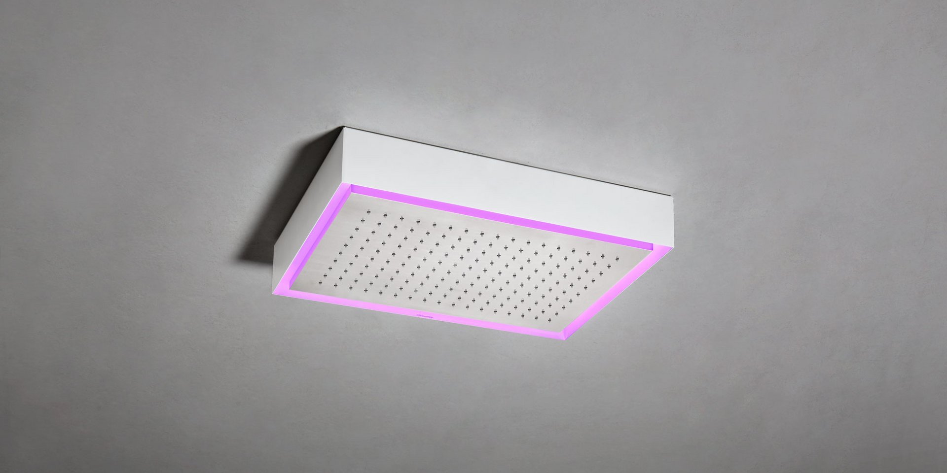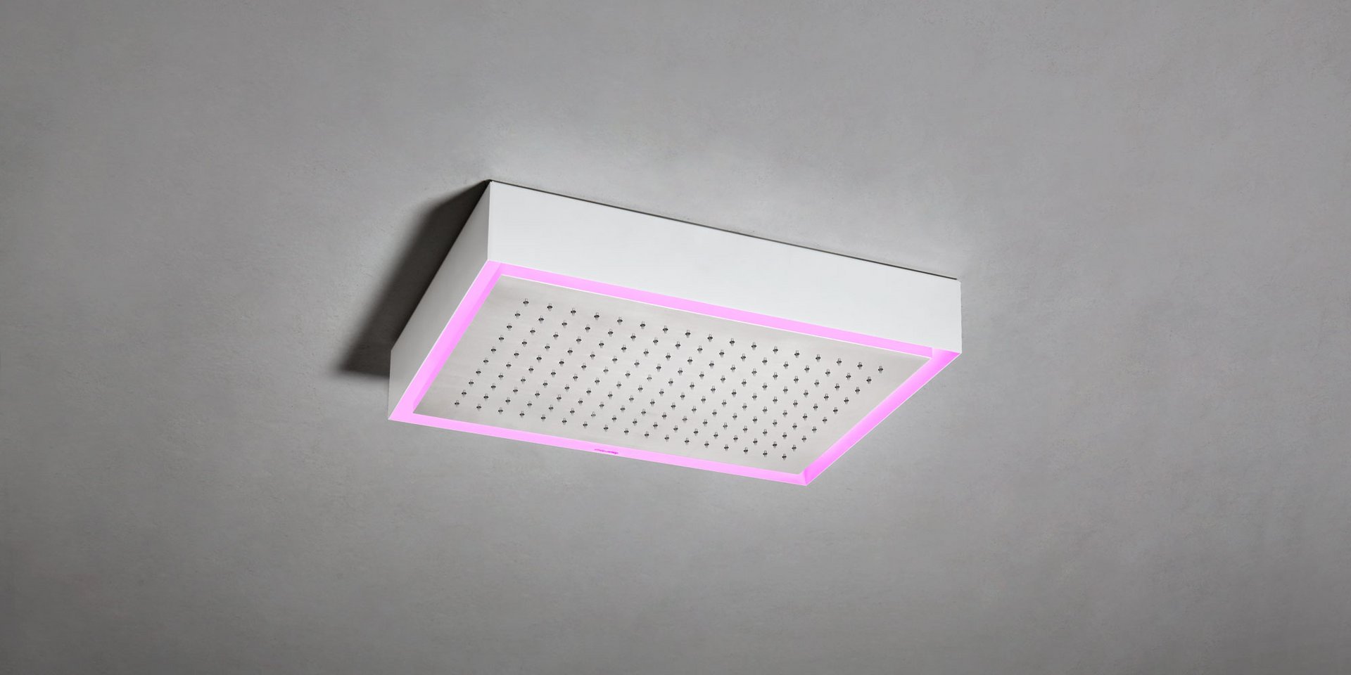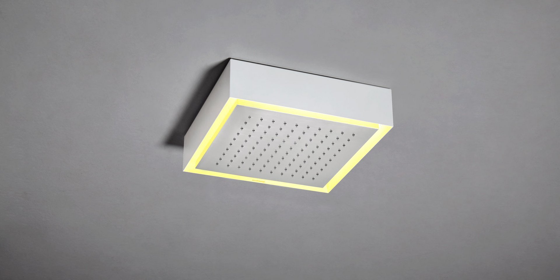 Ceiling mounted showerhead with central shower, waterfall and external frame in steel AISI 304, available in various finishes, with possible LED RGB lighting and waterproof remote.