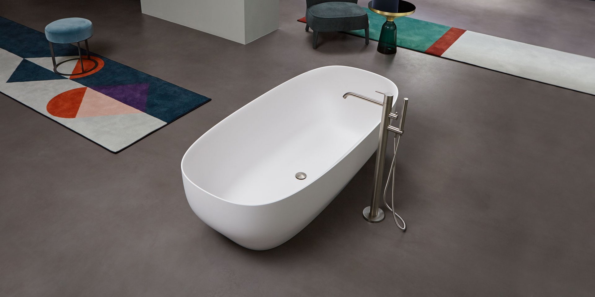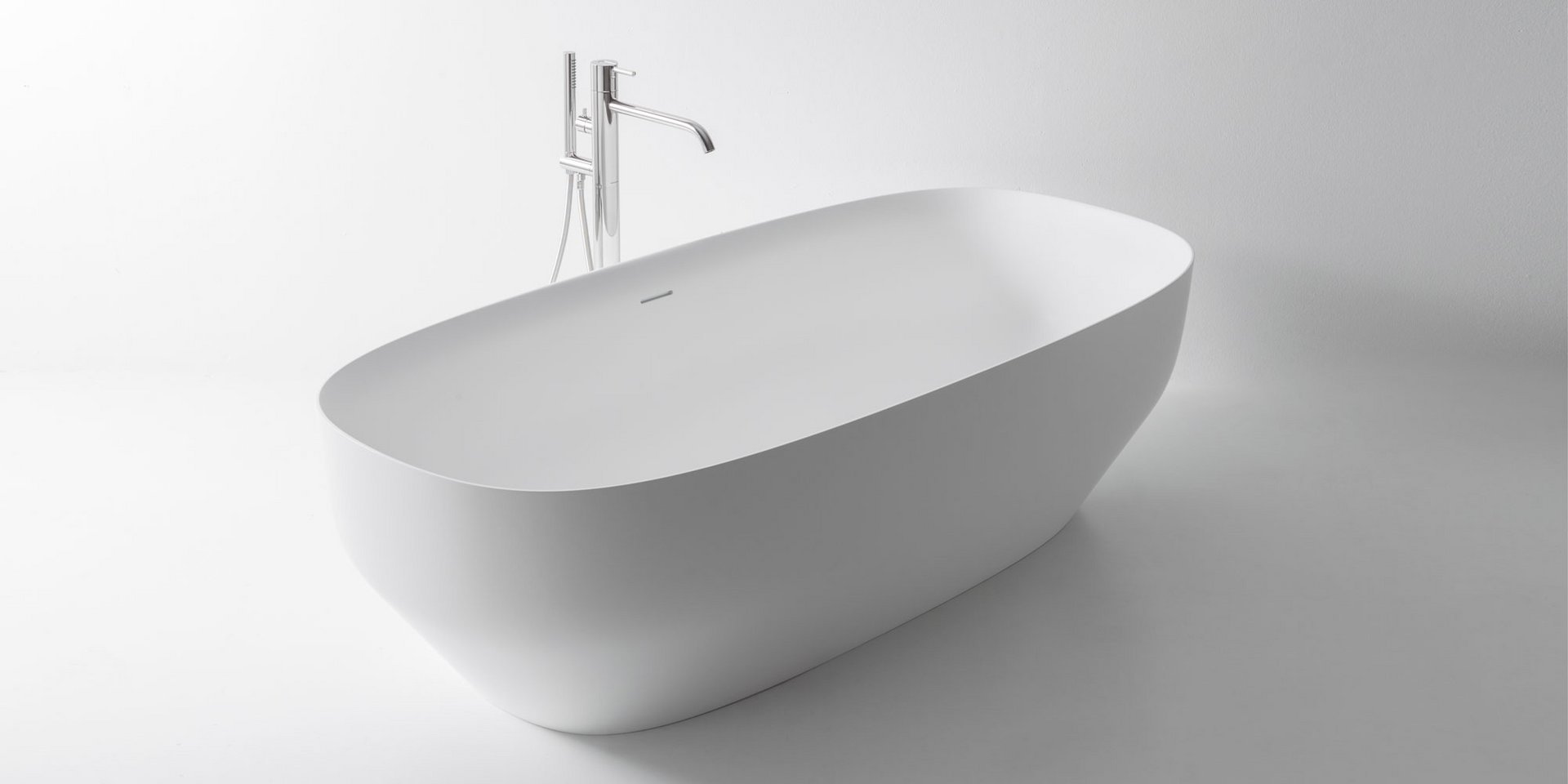 Oval glossy Cristalplant bathtub comlete with drain and pressure plug, siphon and flexible hose. Can be lacquered externally.