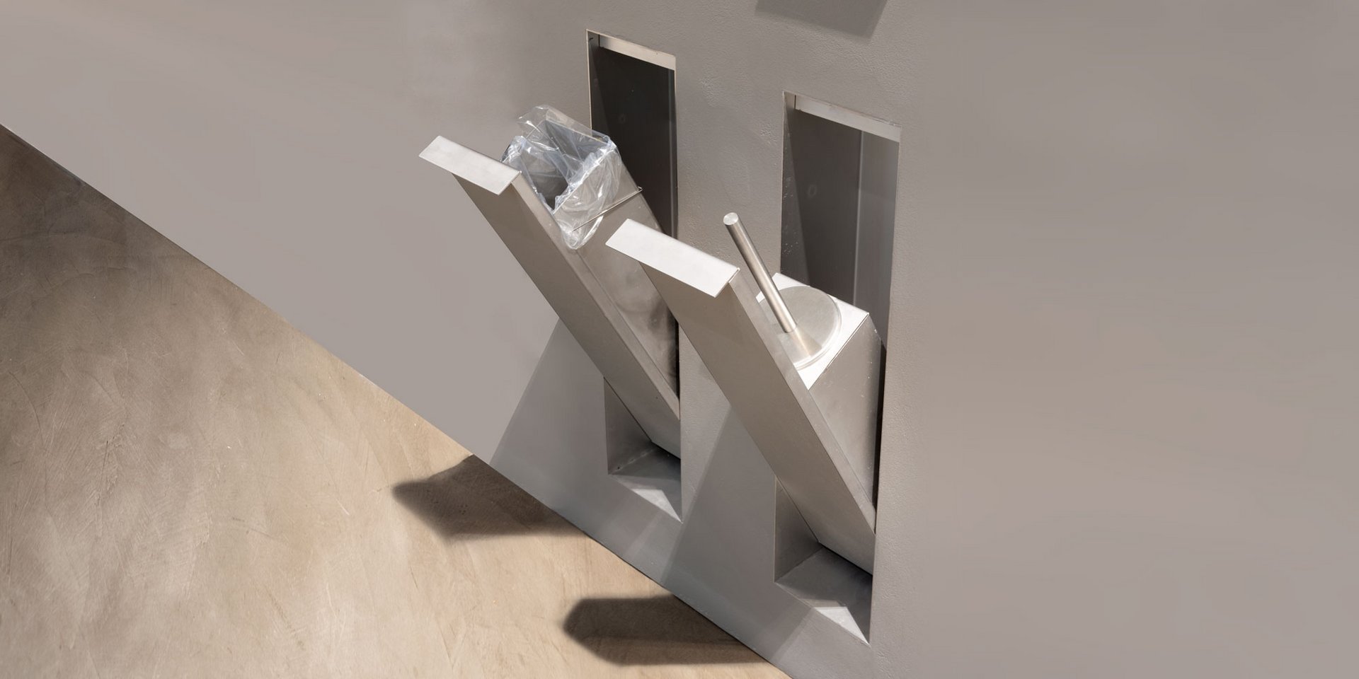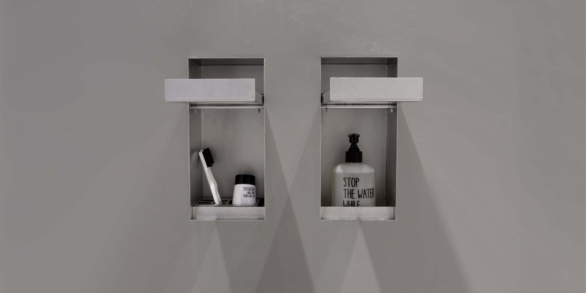 Encased double soap dispenser or brush holder in stainless steel AISI 304 with an aluminum finish.