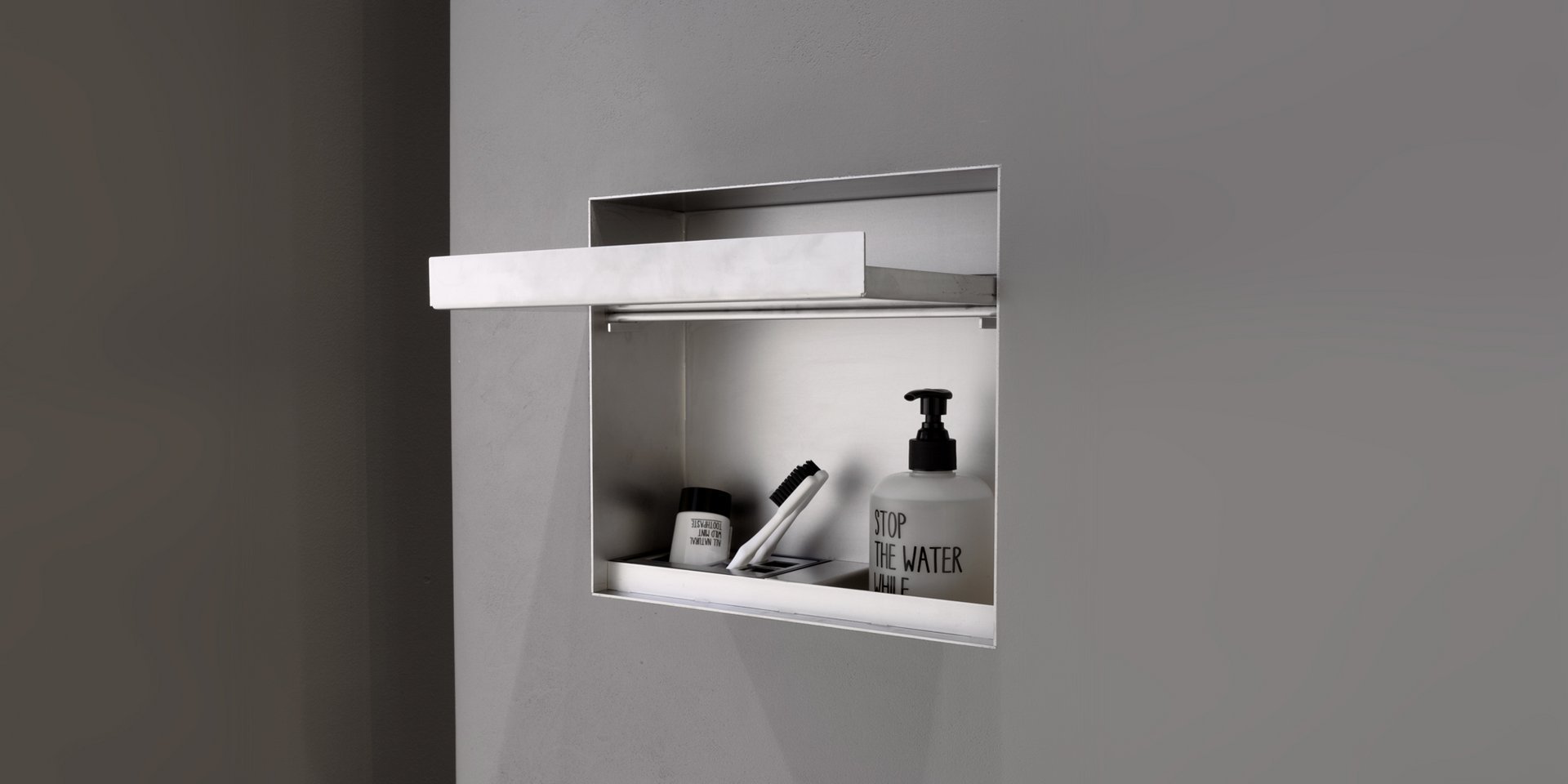 Encased soap dispenser or brush holder in stainless steel AISI 304 with an aluminum finish.