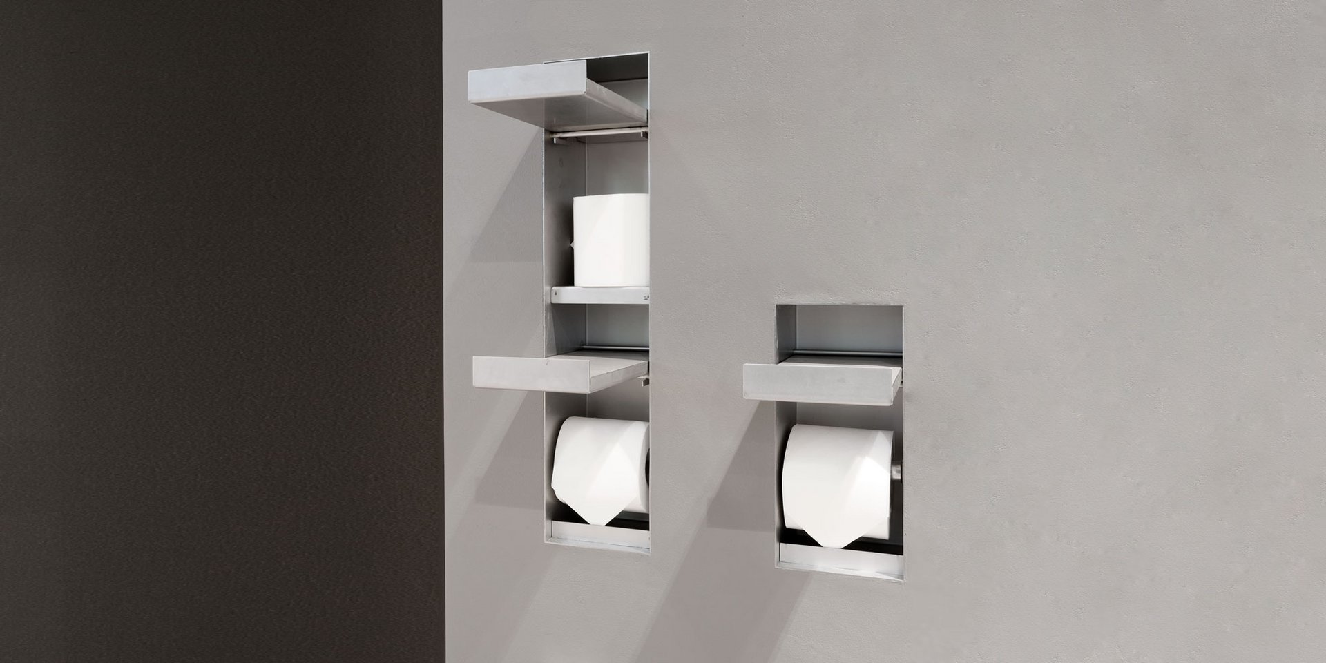 Encased toilet paper holder and spare in stainless steel AISI 304 with an aluminum finish.