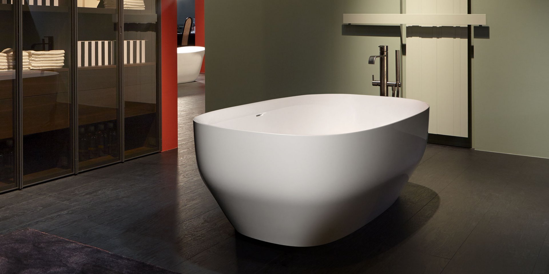 Oval glossy Cristalplant bathtub comlete with drain and pressure plug, siphon and flexible hose. Can be lacquered externally.