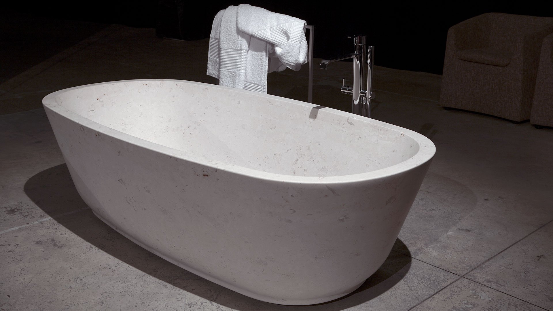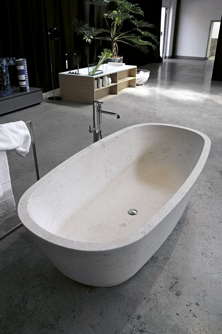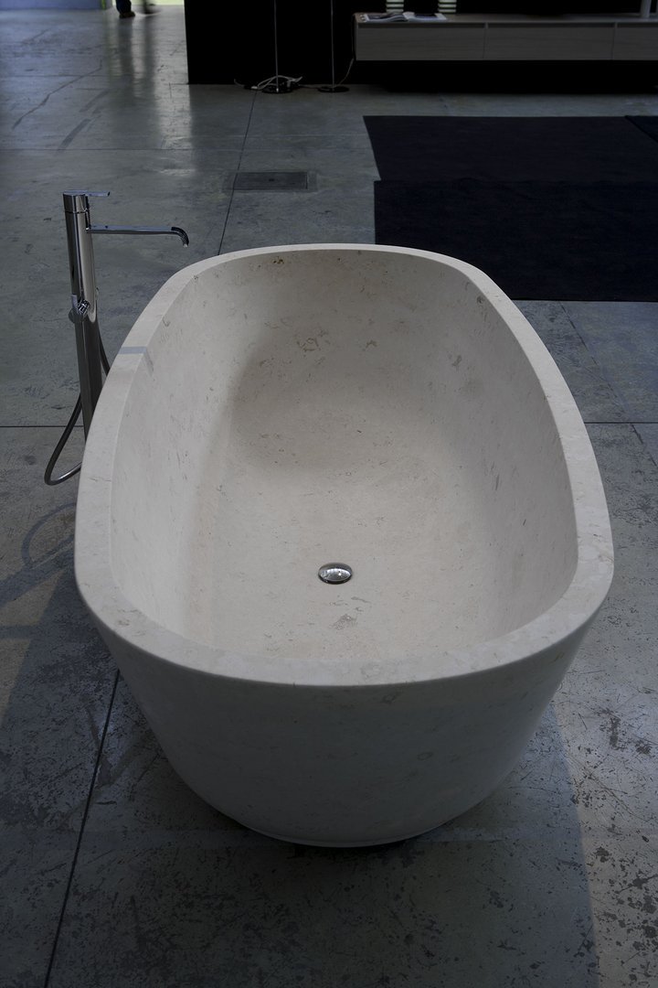 Oval stone bathtub complete with drain and pressure plug.