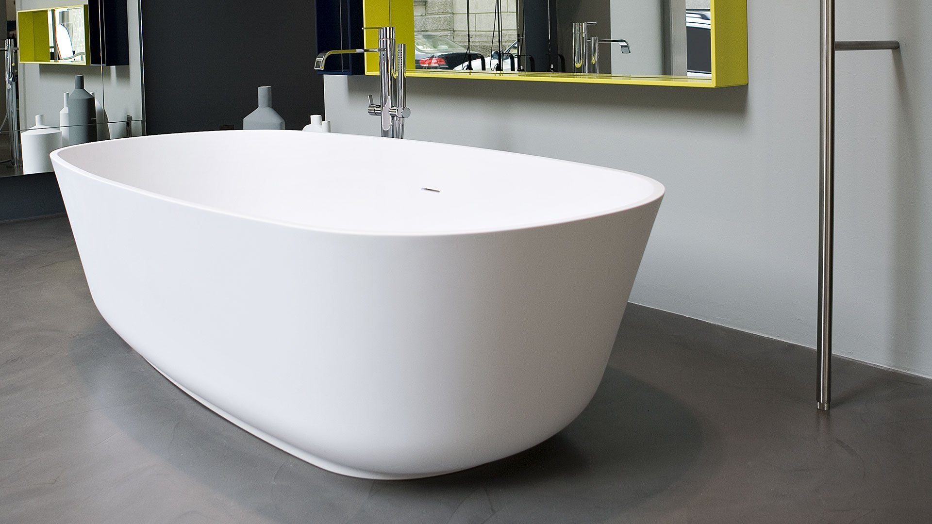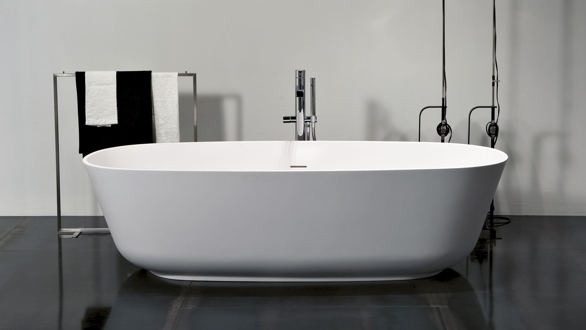 Oval Cristalplant bathtub complete with drain pipe fitting and pressure plug, siphon and flexible hose, that can be lacquered externally.