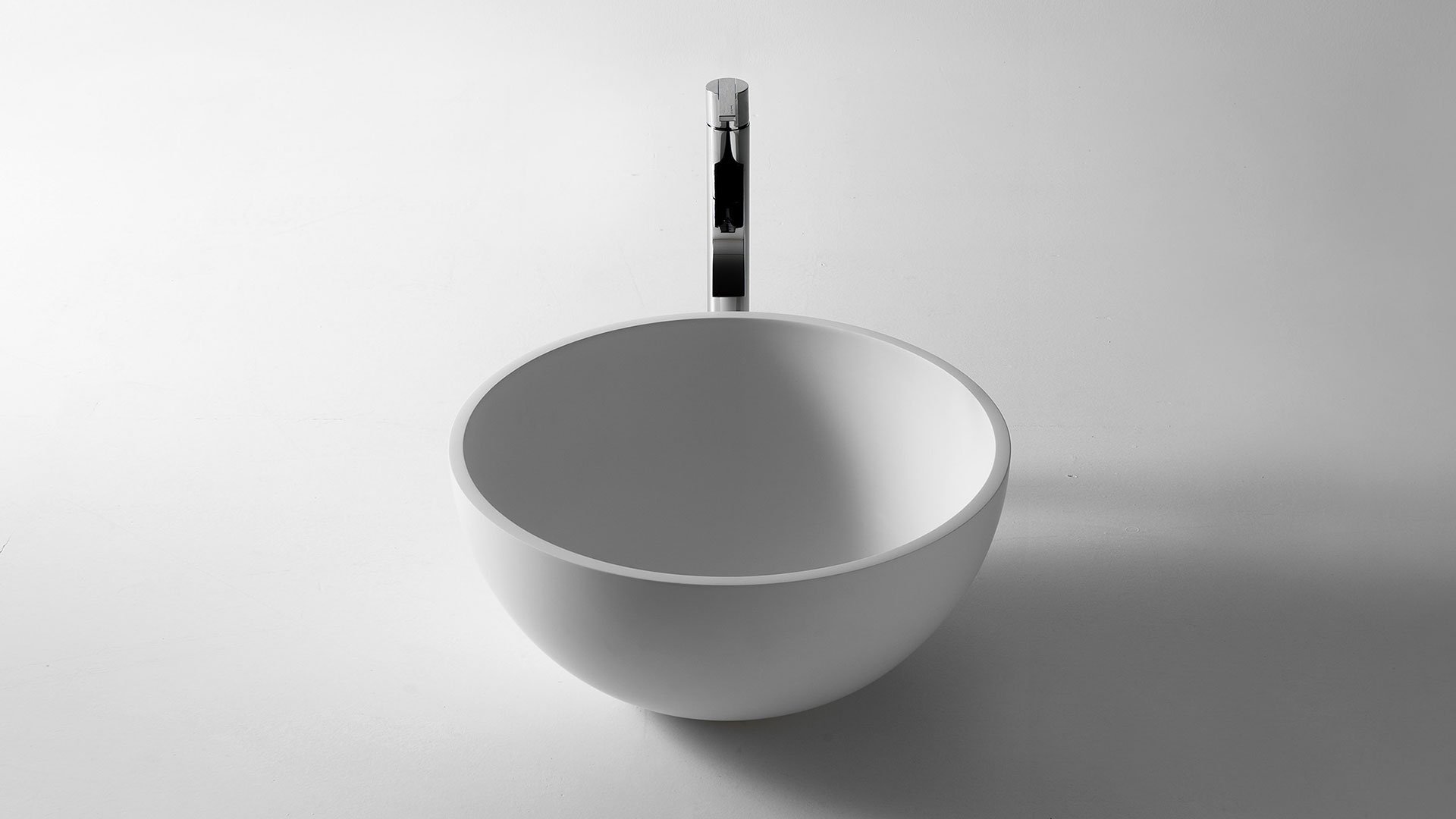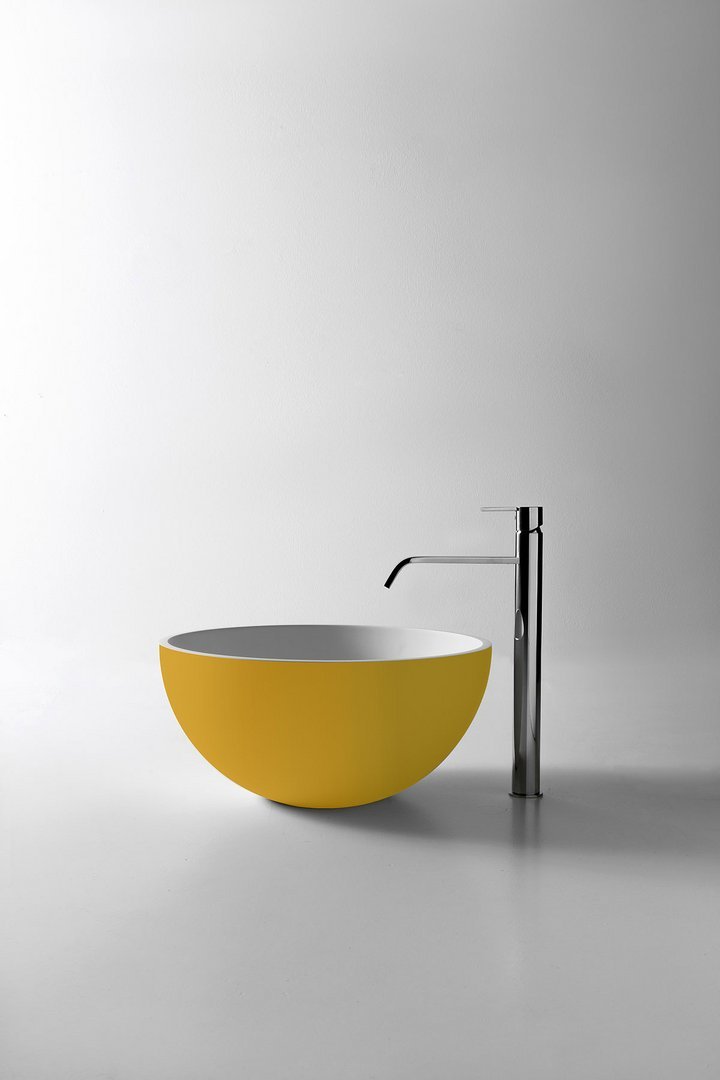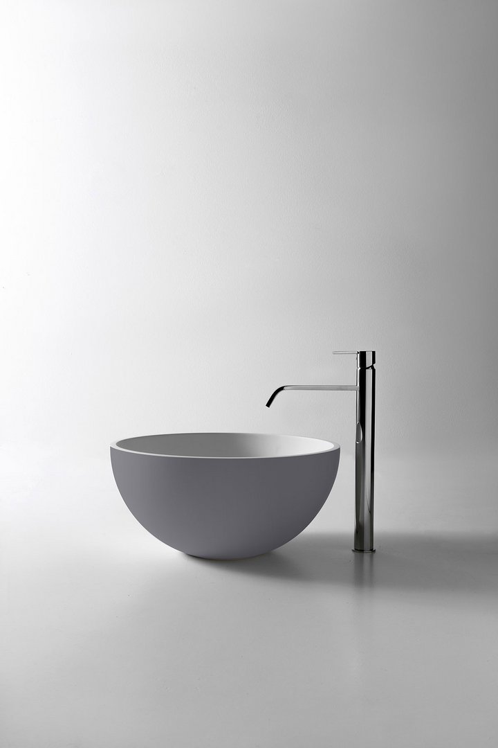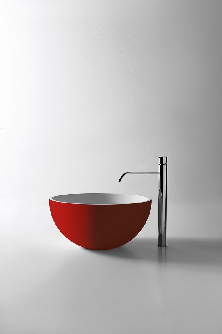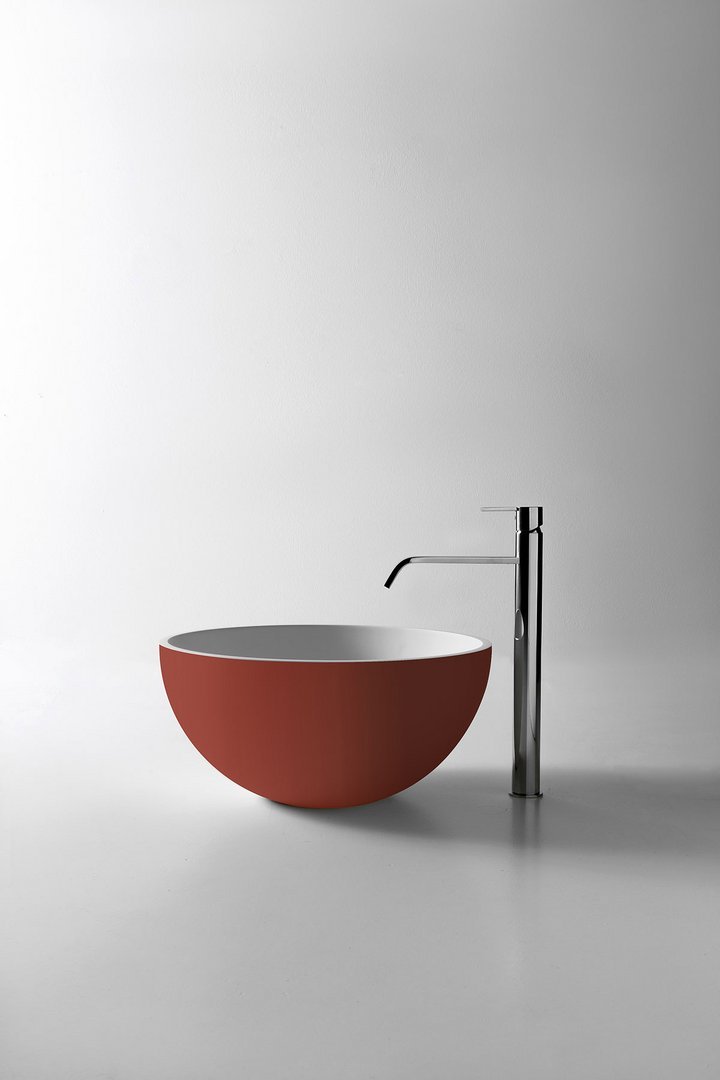 Round top mount Flumood? sink complete with drain pipe fitting and open plug, that can be lacquered externally.