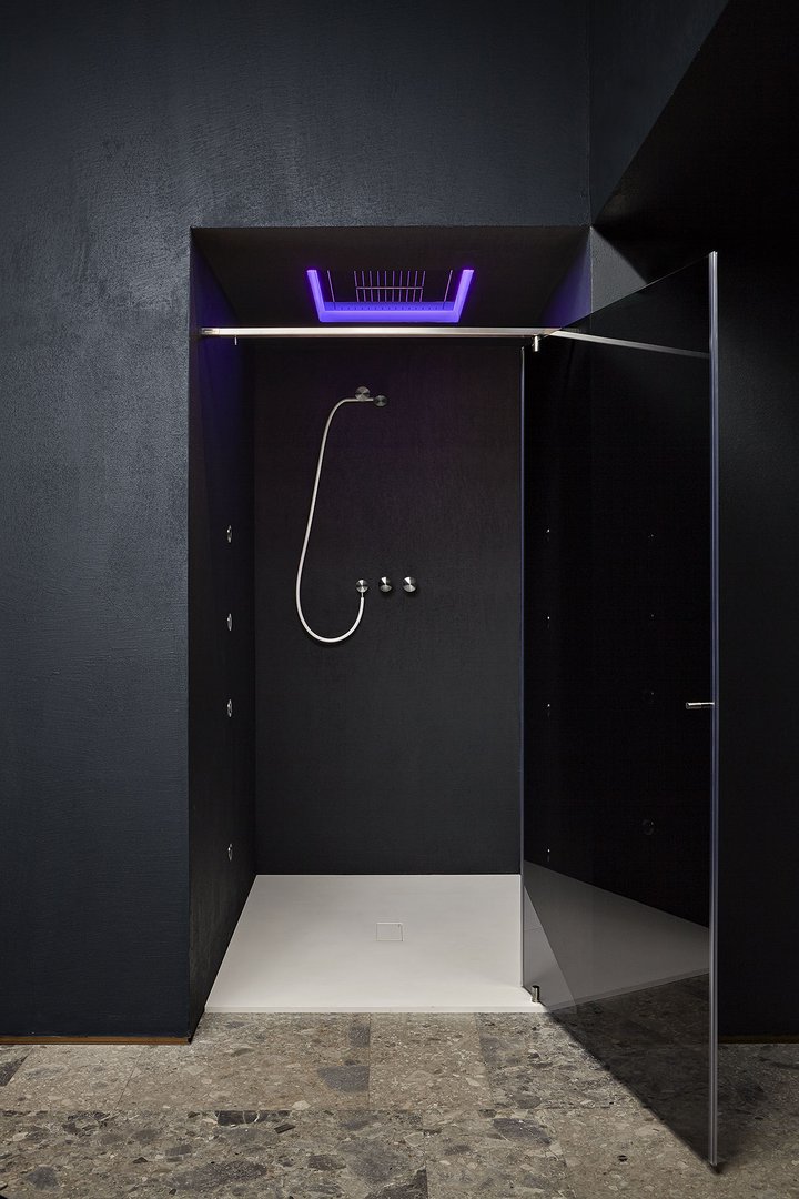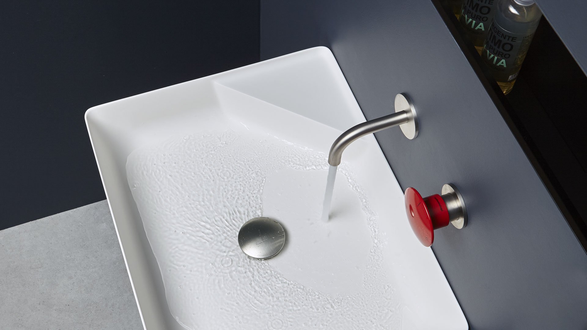 Single lever mixer with a satin stainless steel handle or graphite, lacquered red or white brass complete with concealed valve.