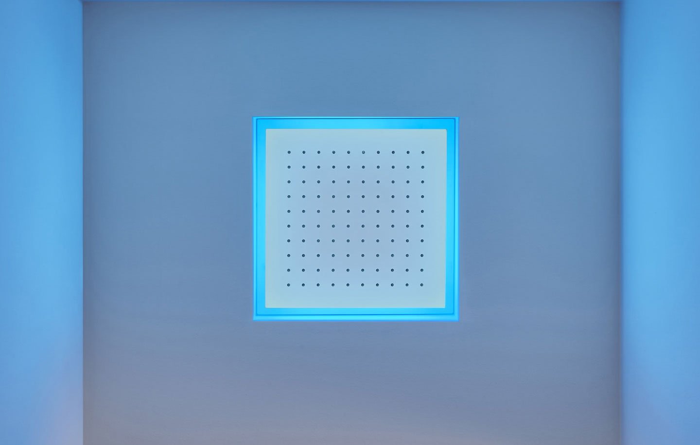Encased waterfall showerhead available in various finishes, with possible rgb led lighting and waterproof remote control.