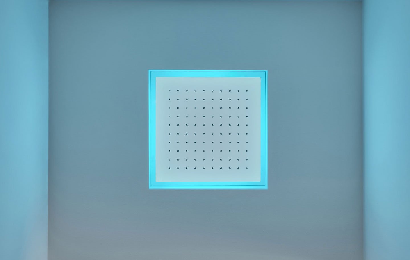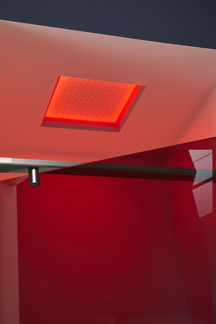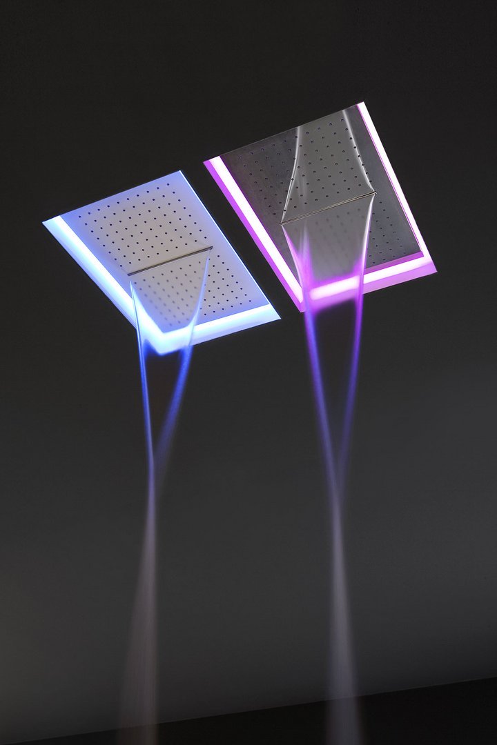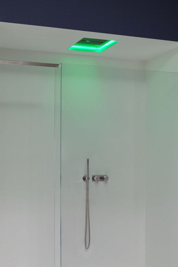 Encased showerhead available in various finishes, with possible rgb led lighting and waterproof remote control.