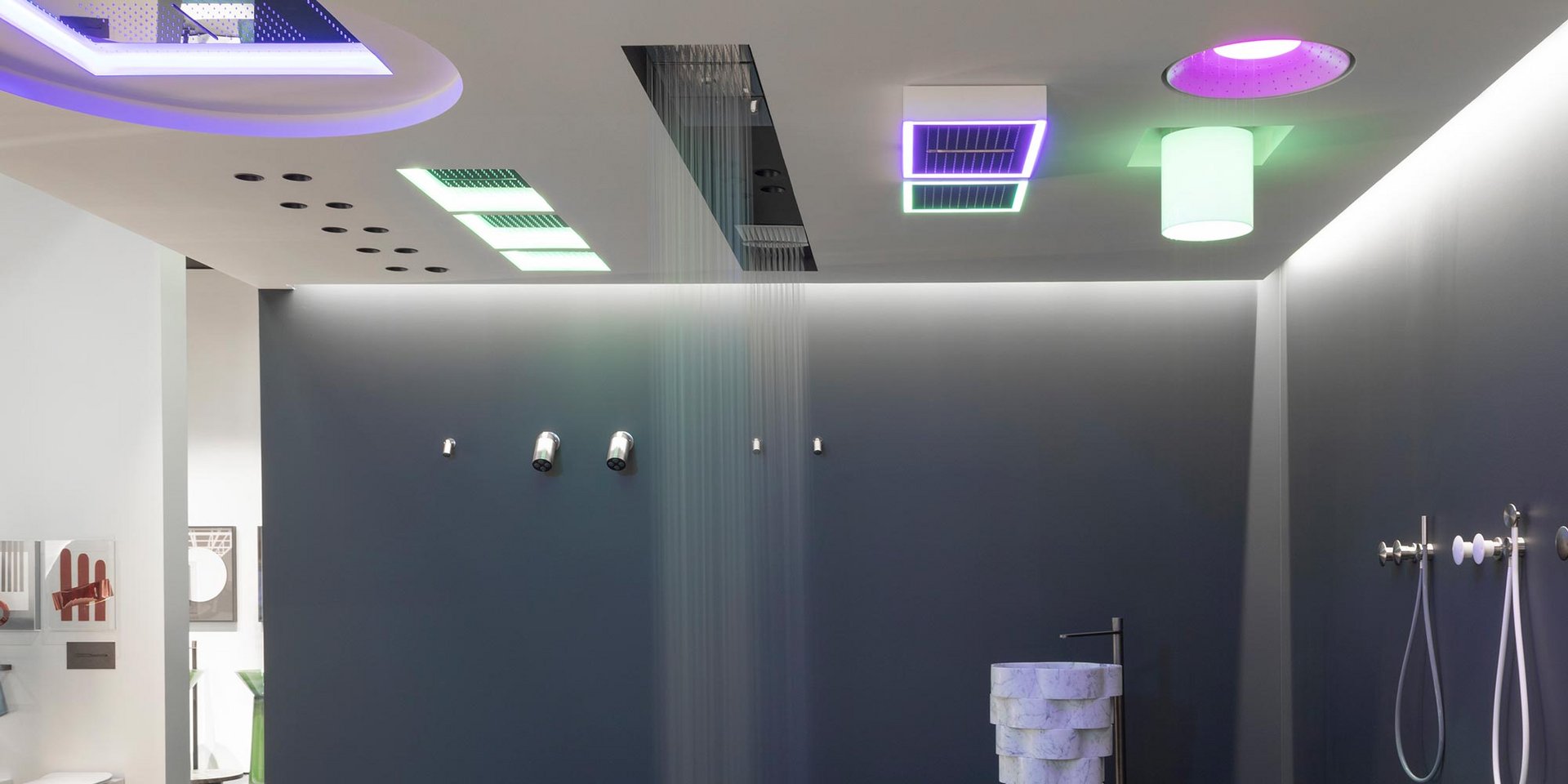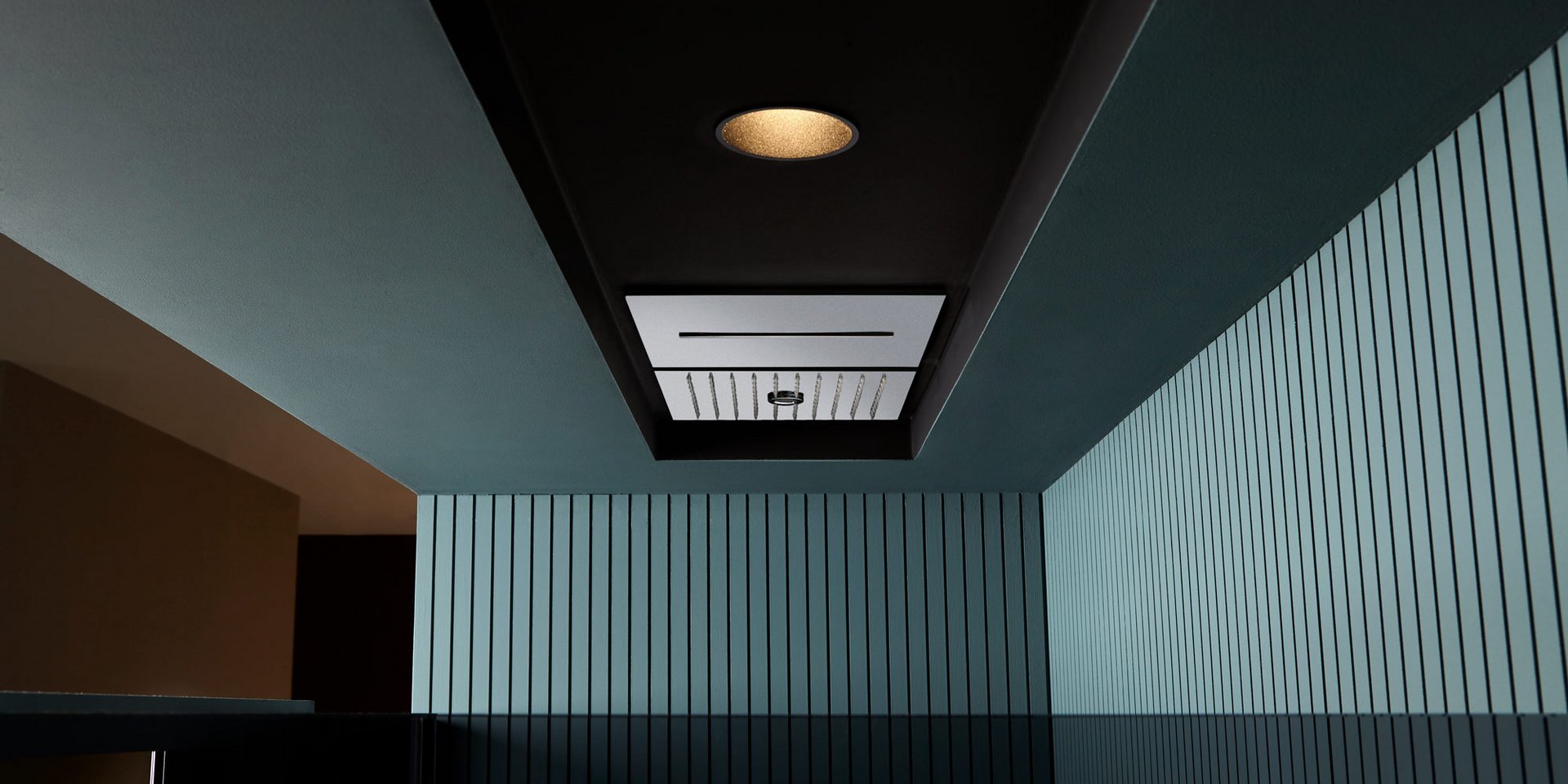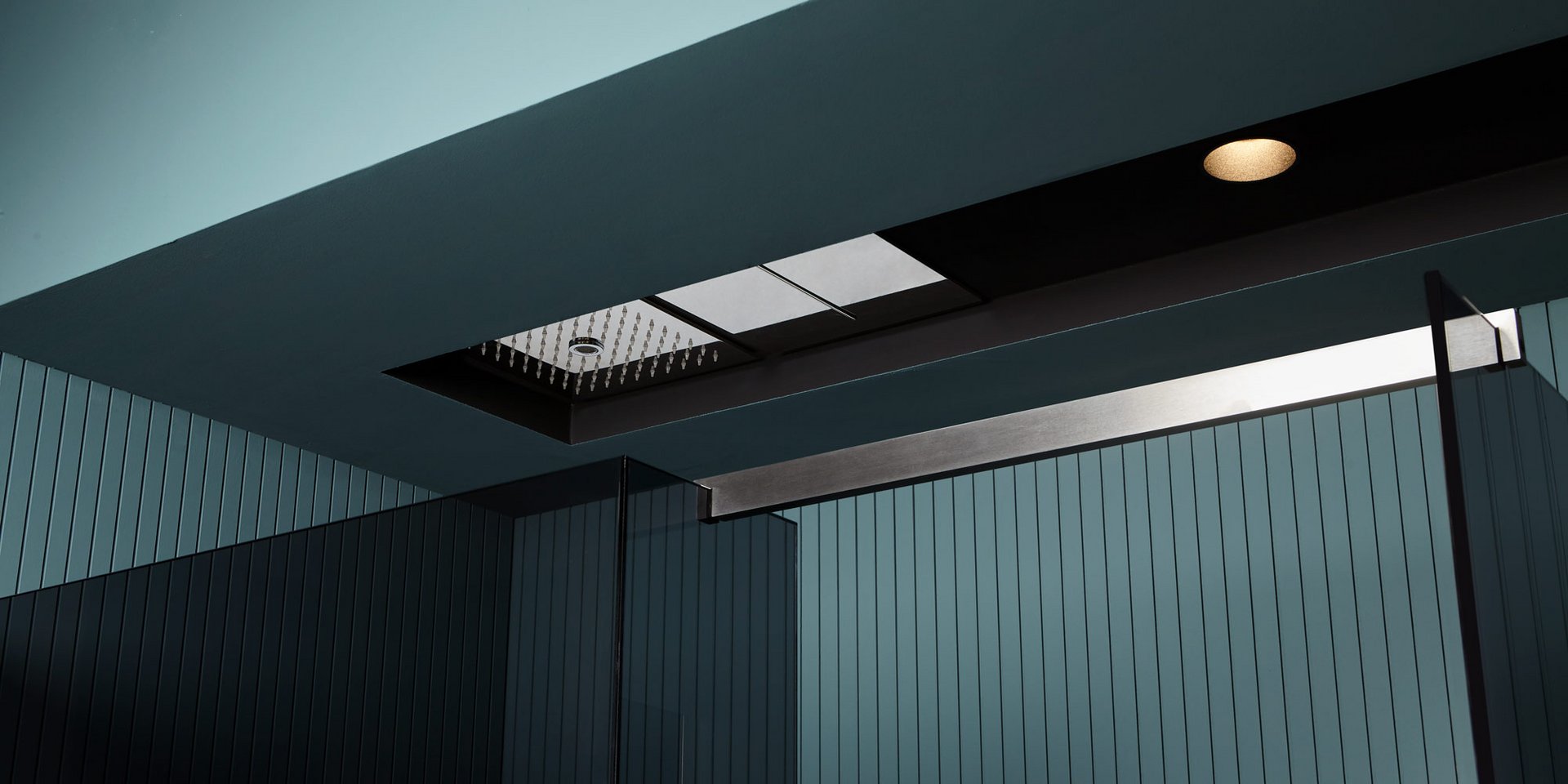 Encased modular showerhead with waterfall in polished stainless steel AISI 304.