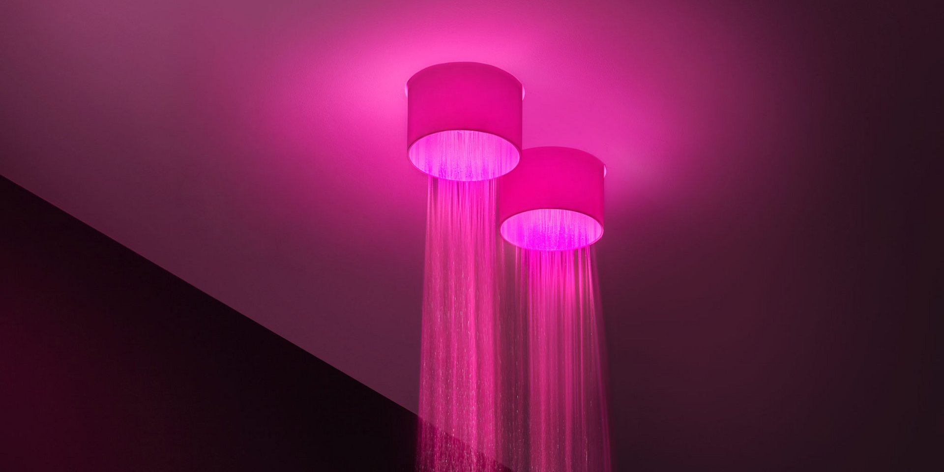 Ceiling mounted shower head in stainless steel AISI 304, complete with diffuser in opal acrylic and LED lighting RGB including waterproof remote control.