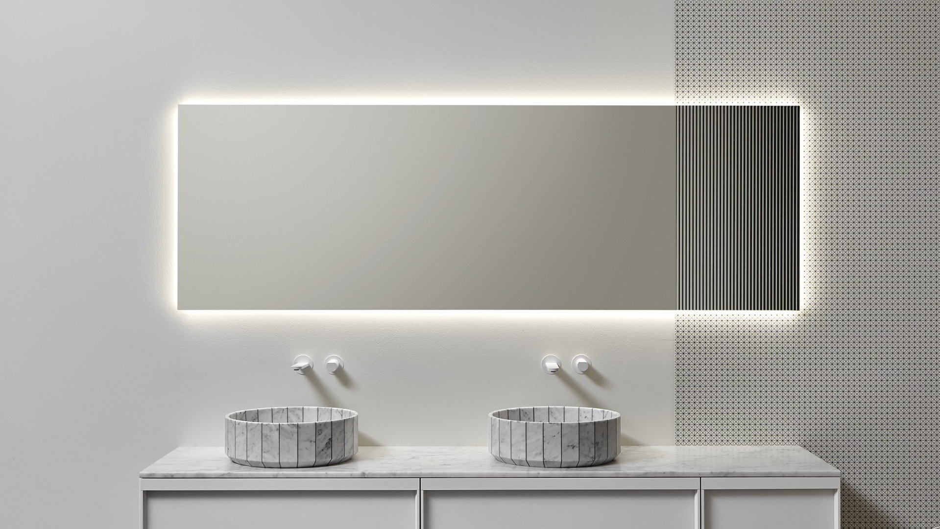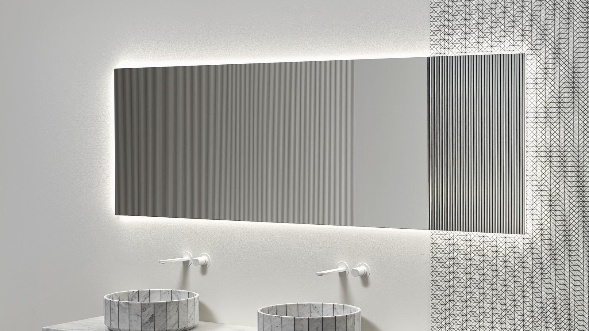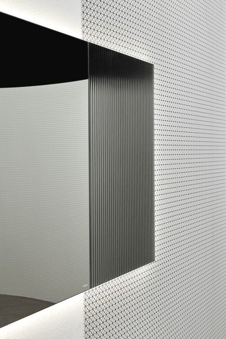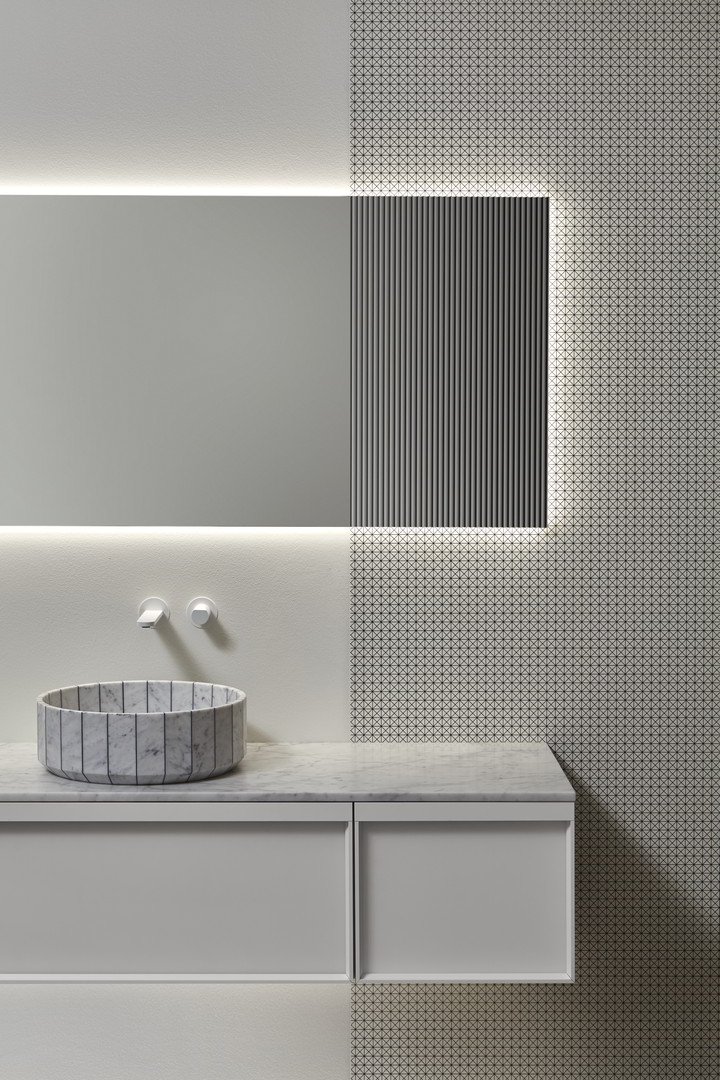Distinto 美麗而本質(zhì),是一面由極端線條定義的鏡子,它是一個矩形物體,可以完美地融入覆蓋著 Tralerighe 壁紙的墻壁上。Distinto 浴室鏡是一款無邊單品,在兩個短邊之一上有羅紋裝飾圖案。Distinto、墻紙和光影在墻上形成有趣的對比。鏡子配有 LED 照明系統(tǒng),與光滑和棱紋鏡子之間的對比相得益彰。
