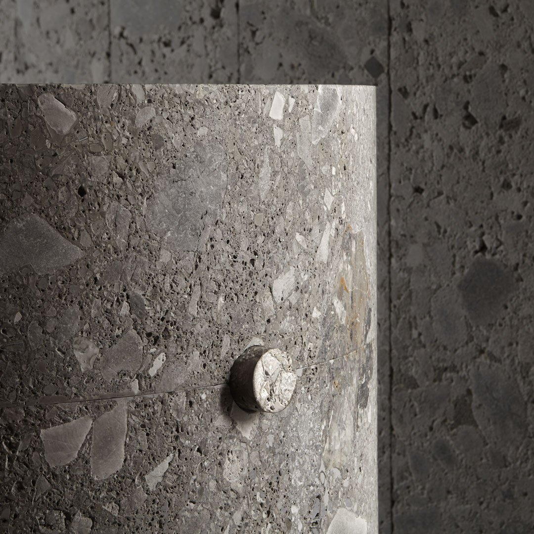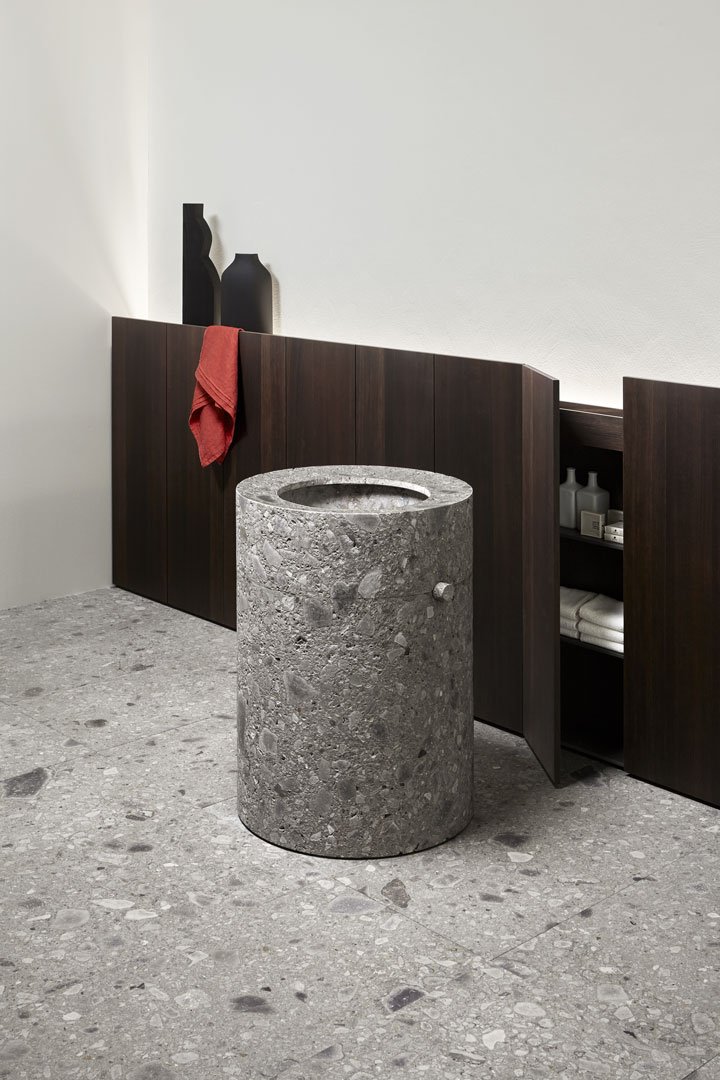 一個完全由天然石材制成的雕塑水槽,甚至傳統(tǒng)的水龍頭也消失了,變成了一個圓柱形的石頭命令。一種漸進和無聲的功能,可將其所有原始力量恢復(fù)為水。結(jié)果是一個讓人想起洗禮池原型的石柱。