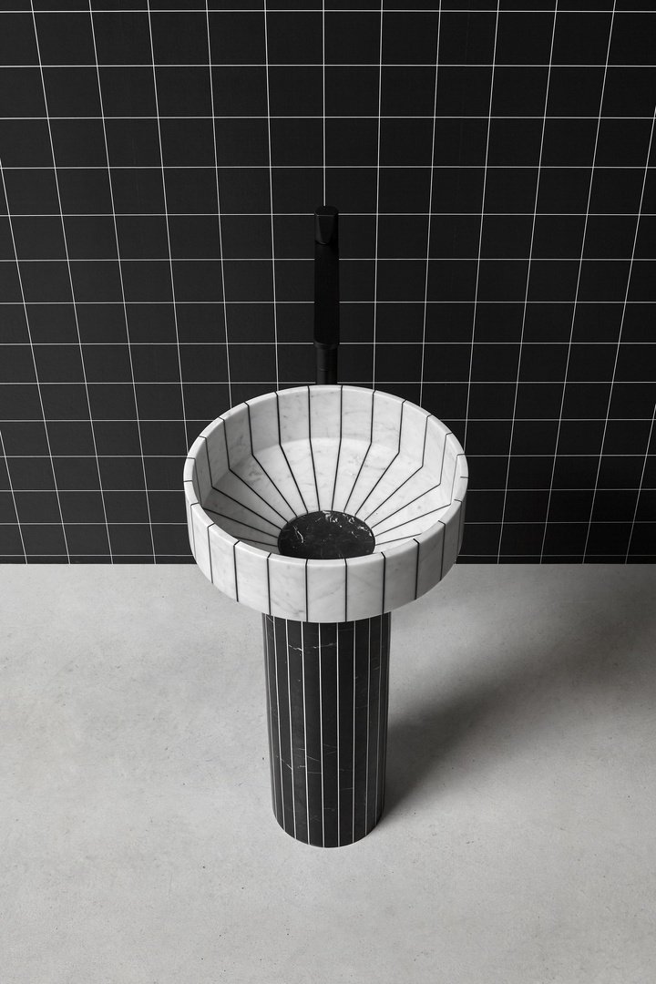 水槽的盆是用卡拉拉大理石和黑色樹脂制成的,相比之下,柱子是用黑色樹脂和白色樹脂制成的。這會產生一種色彩平衡,在不影響整體和諧的情況下改變體積的感知,減輕和“拉長”它們。