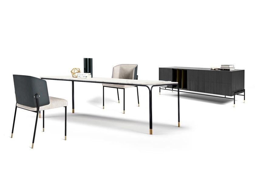 V242 Dining Chair, cm 48x55x74h Seat and backrest in fabric Brera col. 10, structure and flaps in Cuoio col. Graphite, metal structure matt black, feet in light gold finish