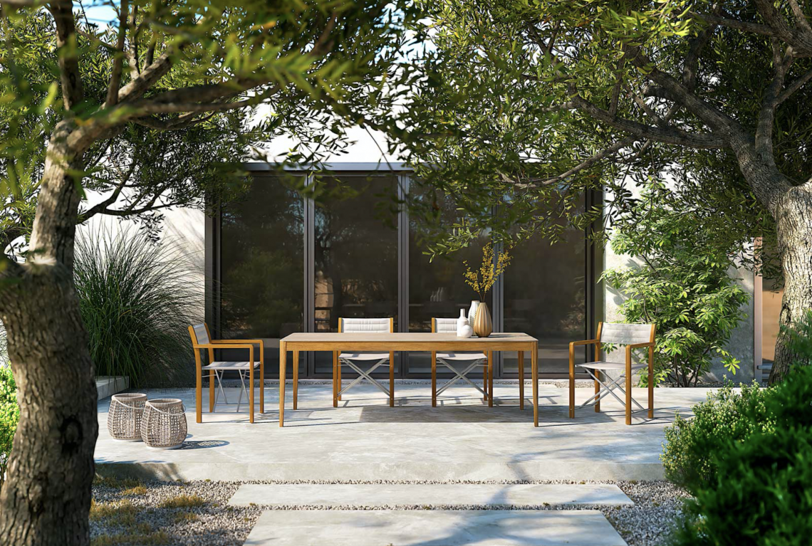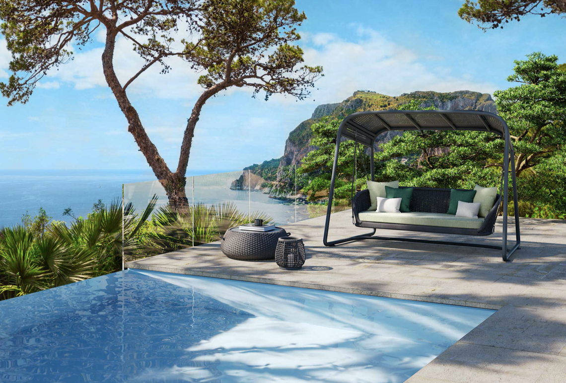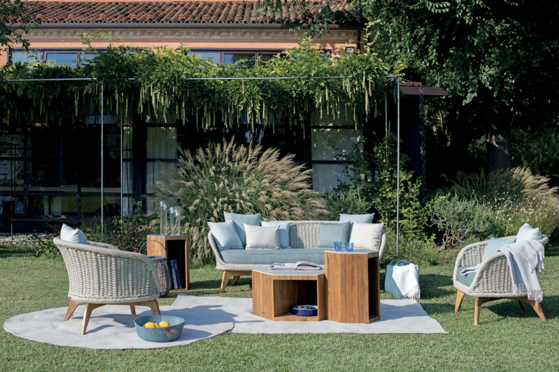 Grazie alle forme organiche, la luce viene filtrata attraverso corde tramate fissate ad una struttura in alluminio. Adatta a rimanere all’esterno tutto l’anno.