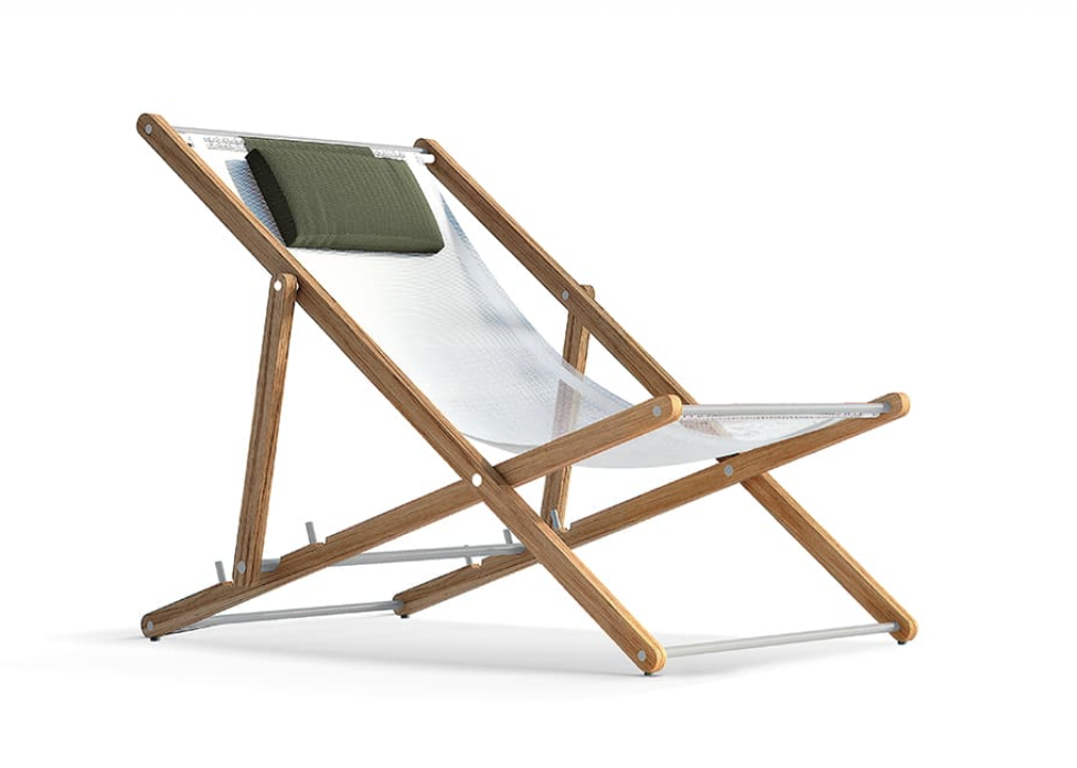 Strutture in TEAK massiccio Asiatico e dettagli in acciaio satinato. Seduta in tessuto termosaldato per esterni textilene bianco o nero.