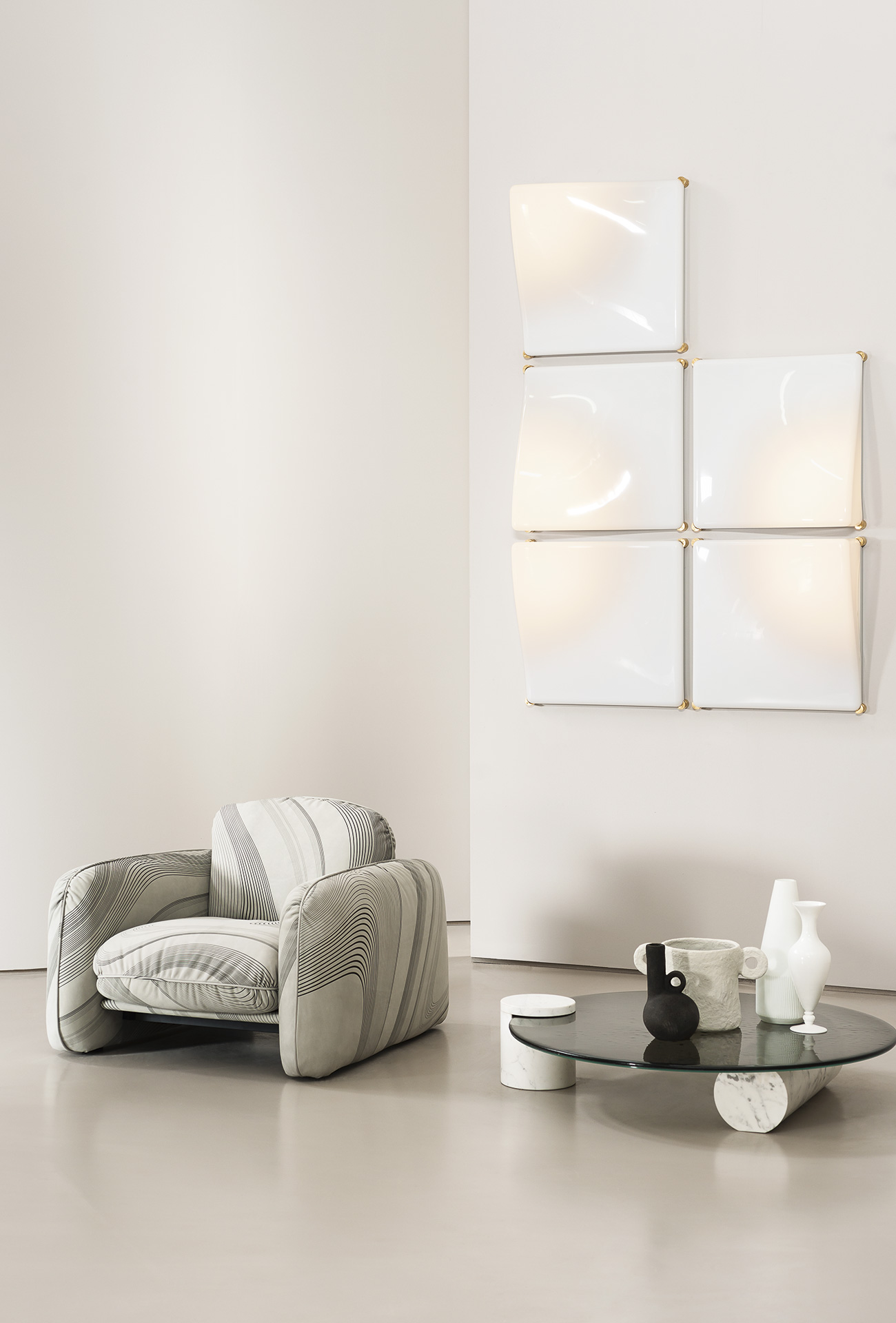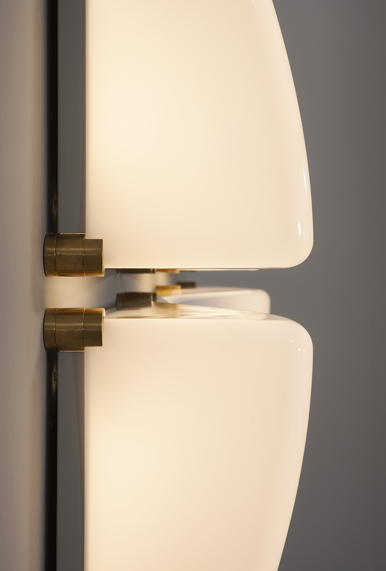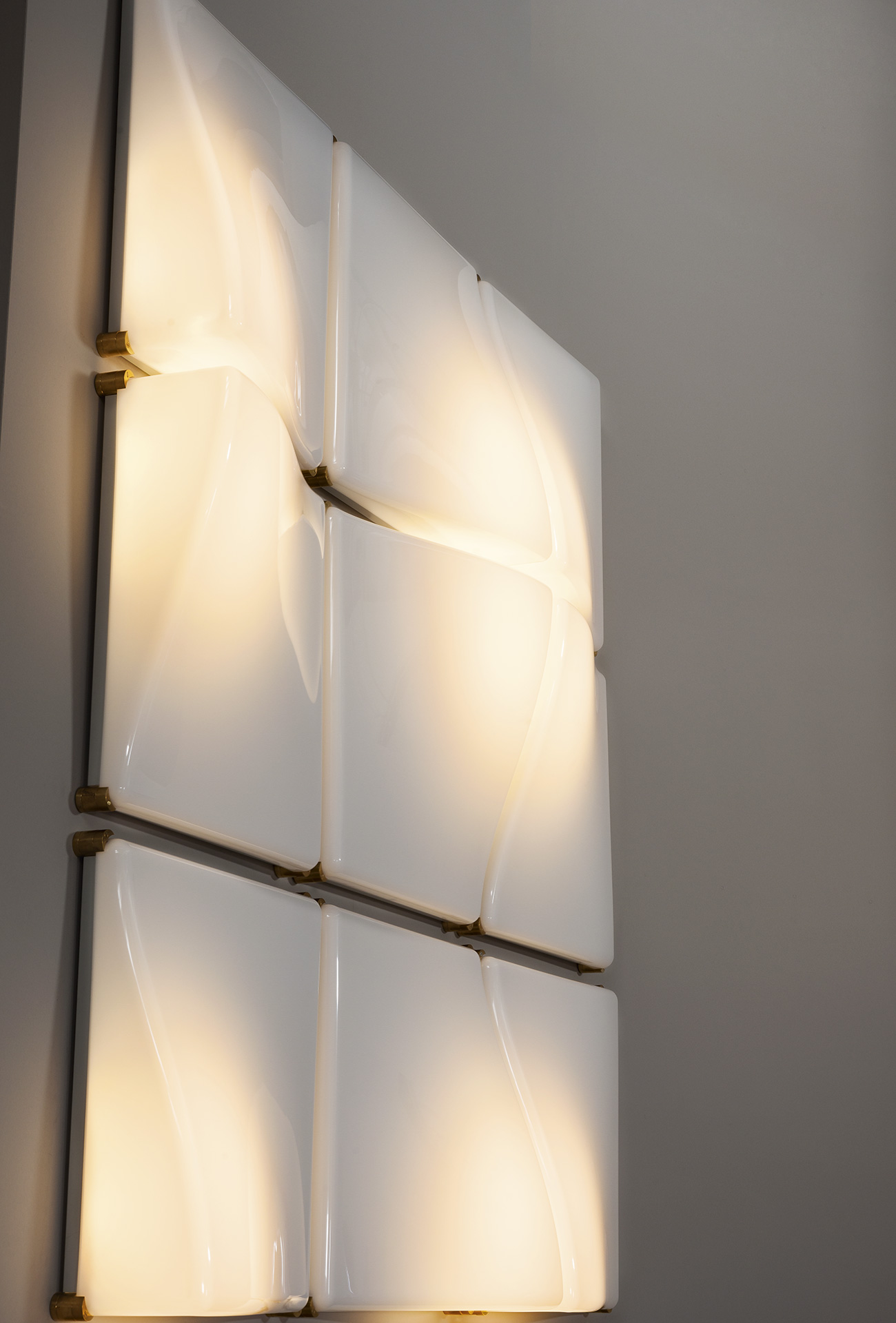 Modular wall/ceiling lamp with 2700K led light source. White lampshade in printed opal methacrylate. Details