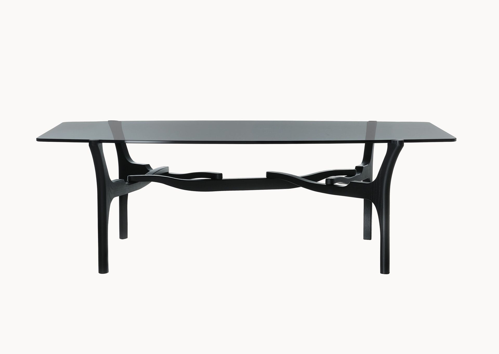 Biomorphic wood triangulates on the side table and stabilises larger tables with a diagonal crossbar. The stabilising structure twists like entwined fingers, and legs come out of the table like bent knees.