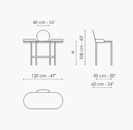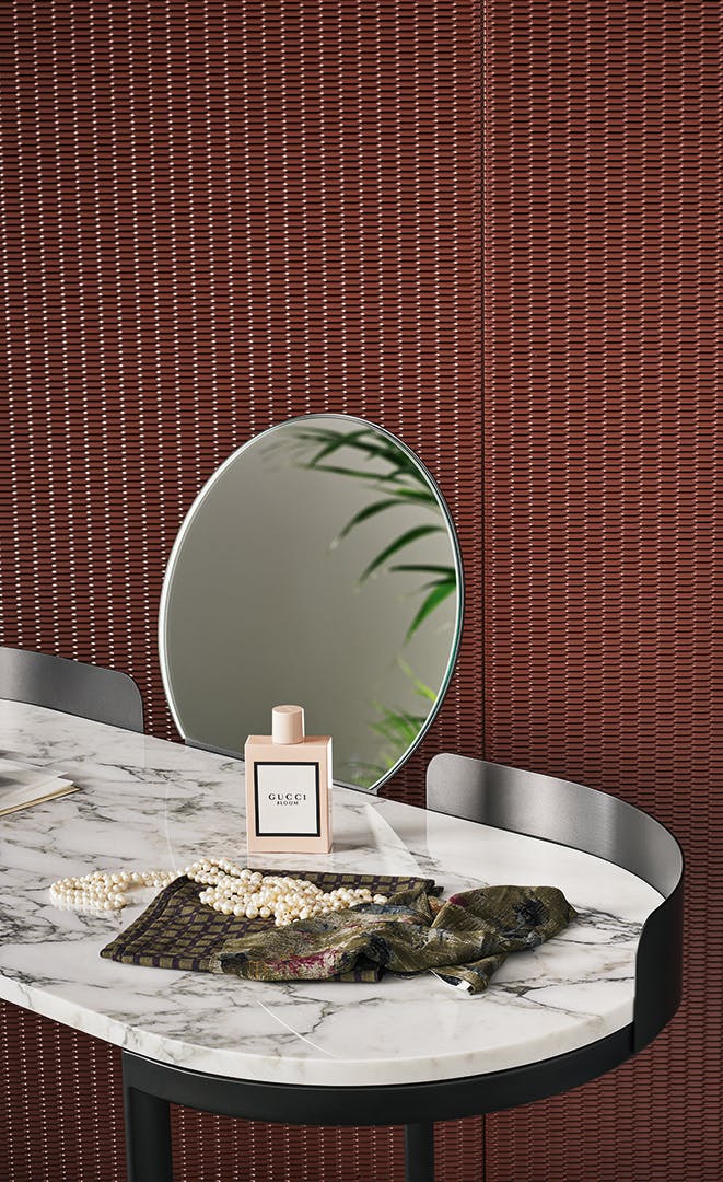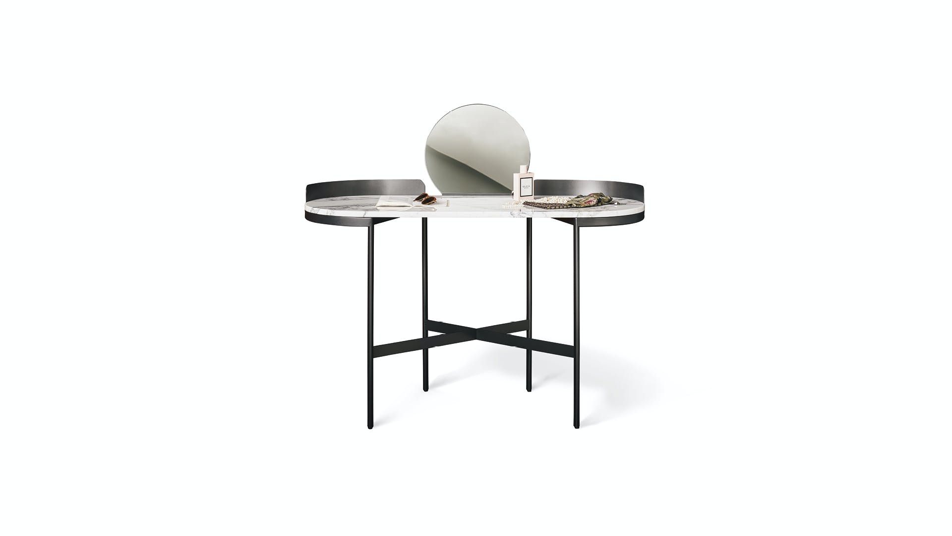 The Asia model is a multifunctional piece of furniture. It can turn from a desk into a vanity table with the addition of a mirror. The top features only rounded lines, and it is available in either marble or ceramic, while the structure base is made of metal. The idea behind the modern writing desk is a blend of form and function, a stylistic sophistication expressed through a daily commitment to harmony.