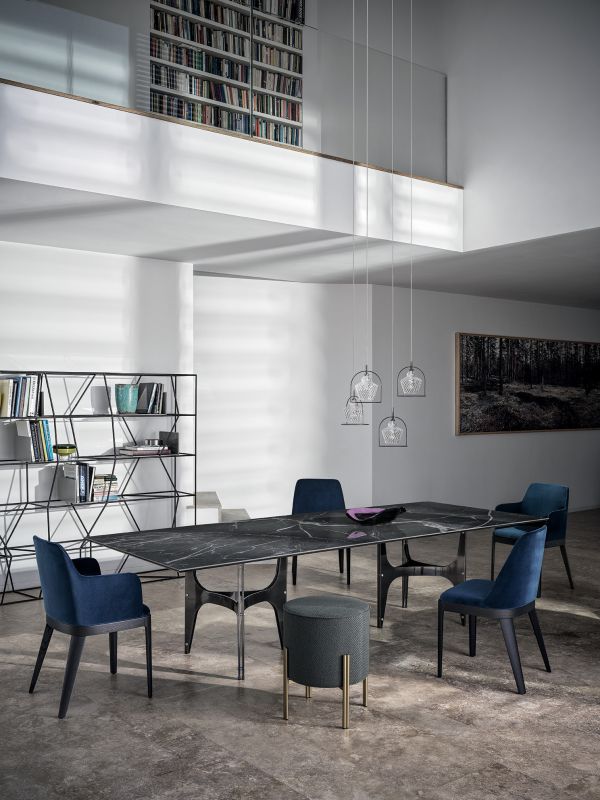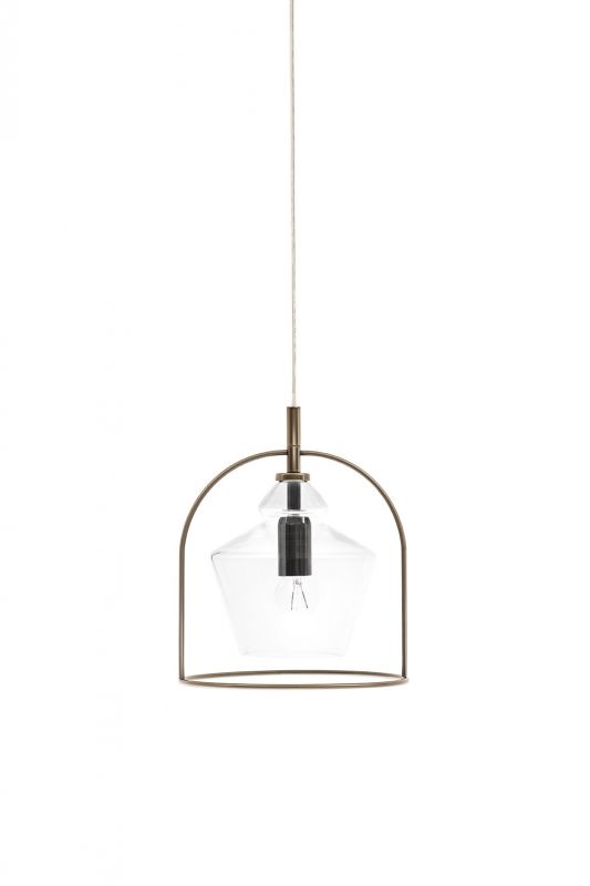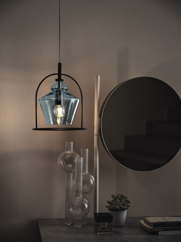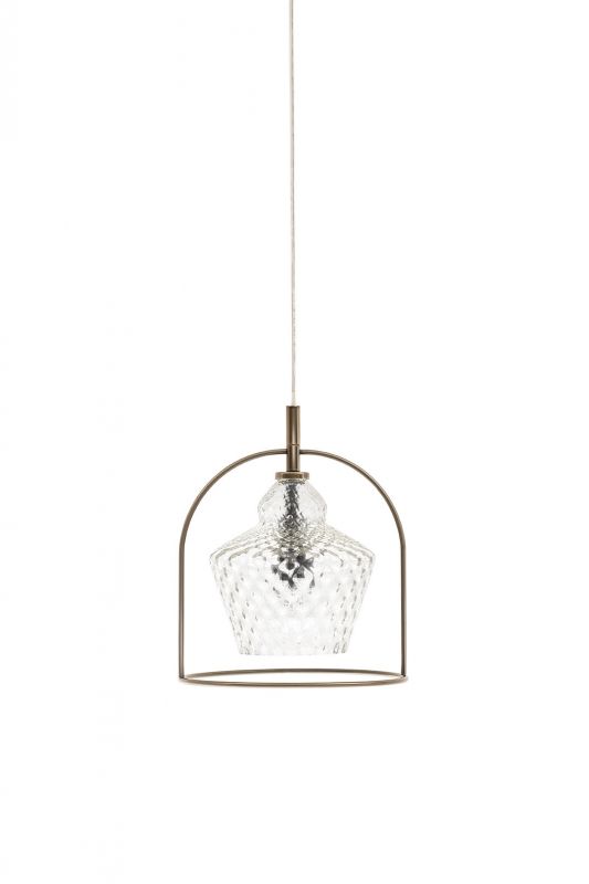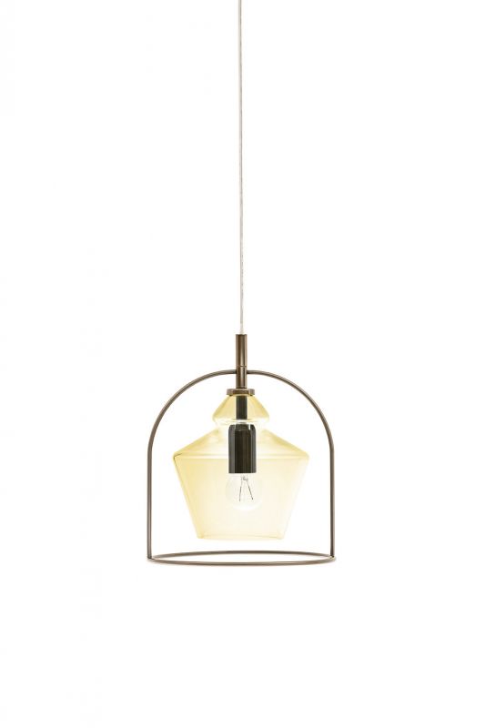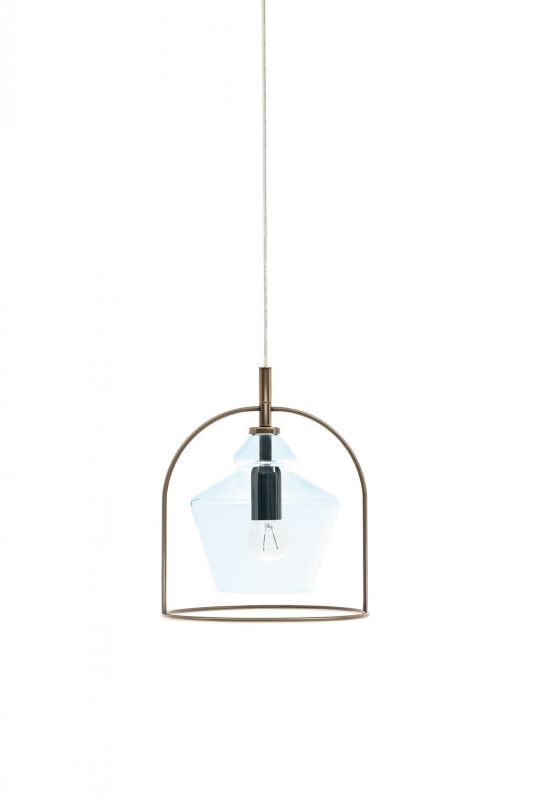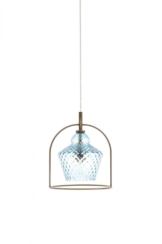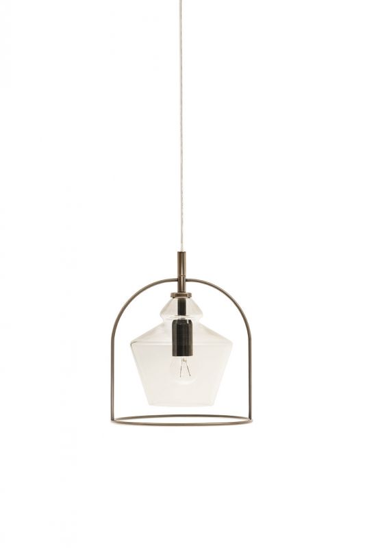 Ceiling light with chromed celiling rose and transparent cable. Laquered metal frame. Hand floating glass.