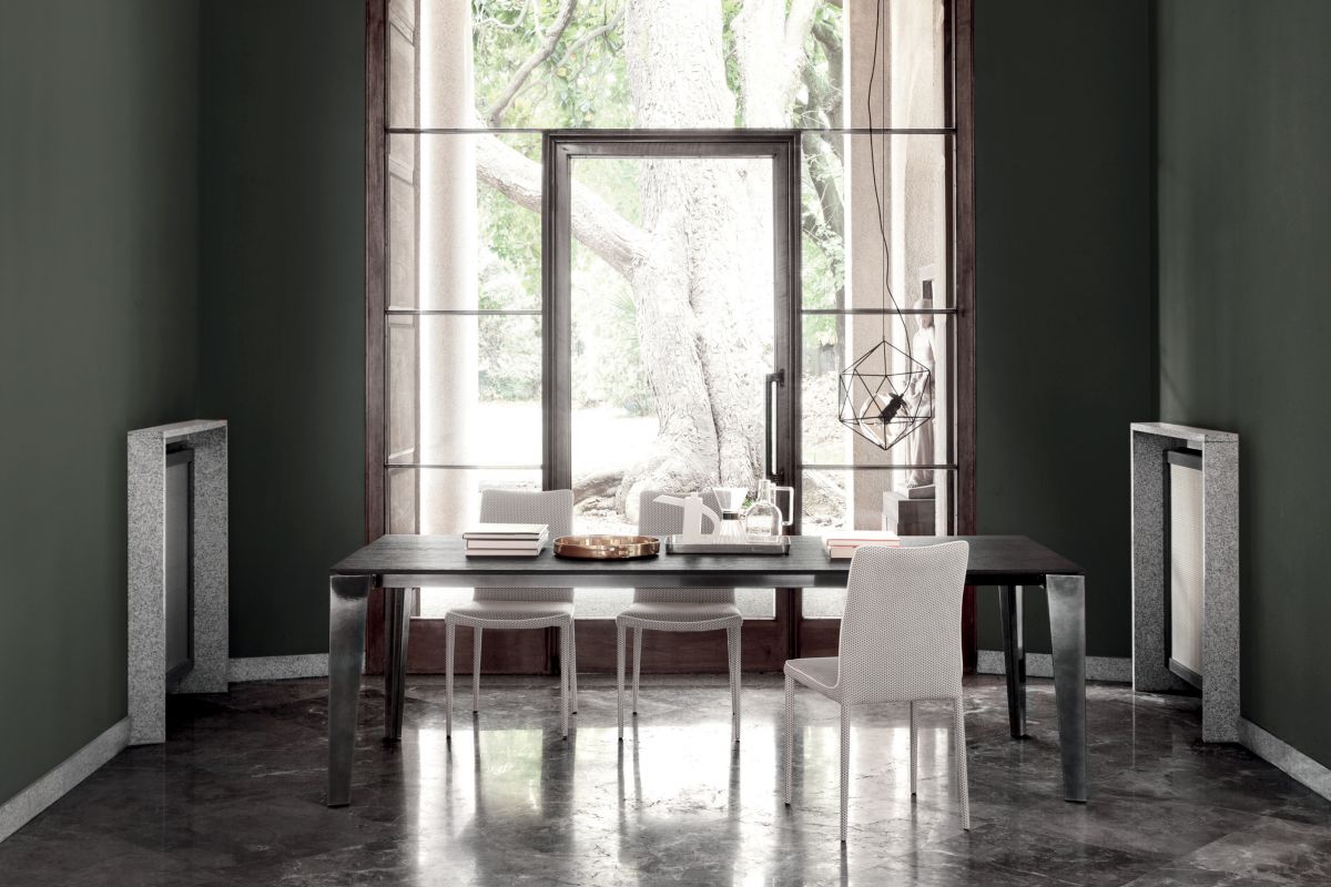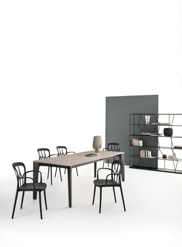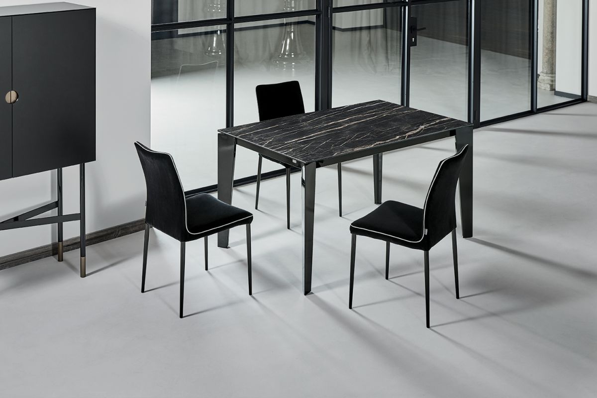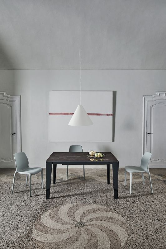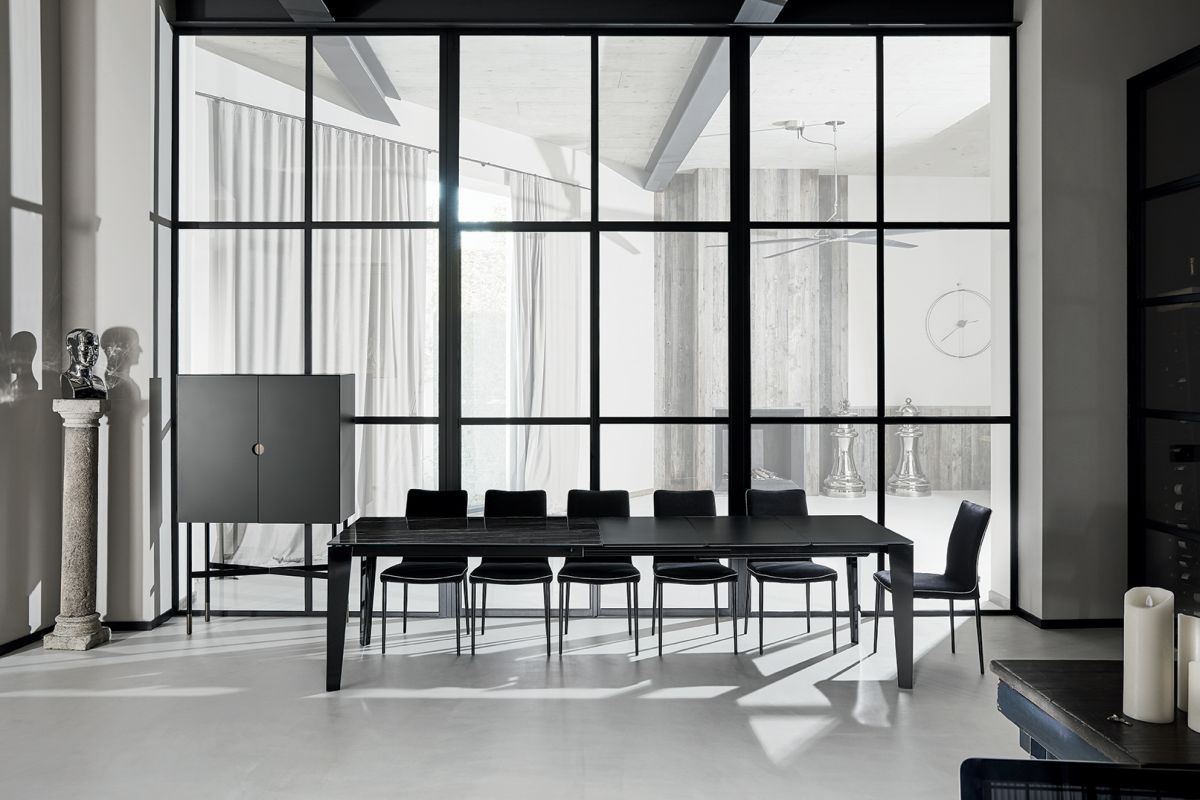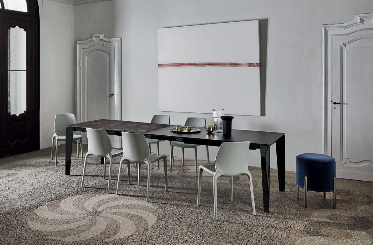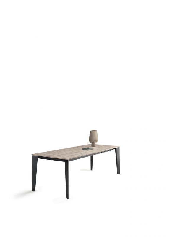 Table with extensions and lacquered Metal frame. Top in melamine, laminate Fenix, veener, glossy Glass,velvet matt Anti-scratch Glass, SuperCeramic or SuperMarble