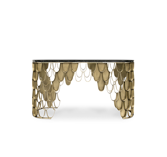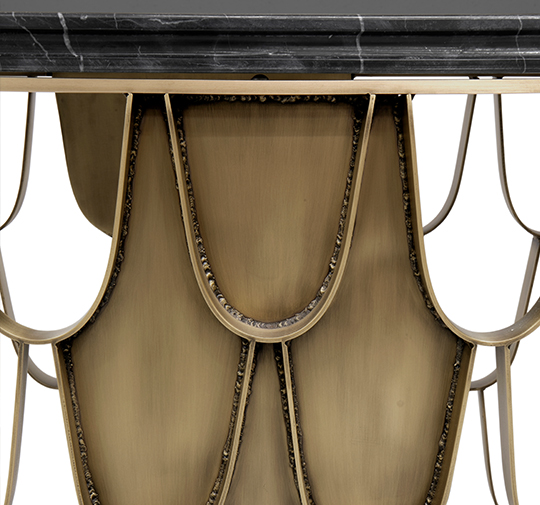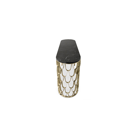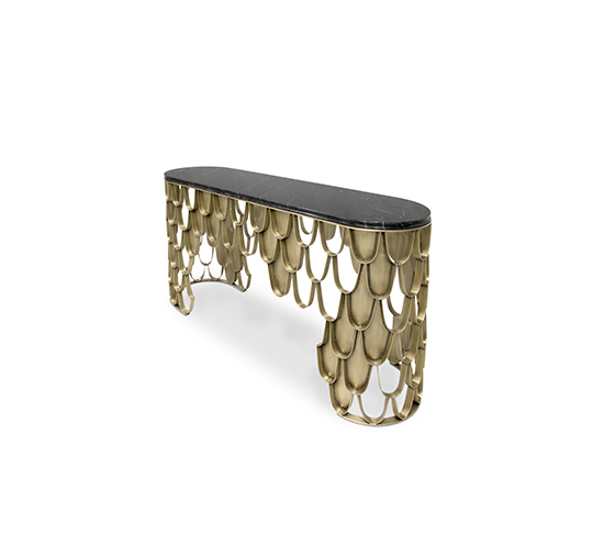 Koi Carp is a recurring symbol of Japanese culture. Its natural colour mutations reveal their capacity to adapt, just like KOI Console Table. With a base in brushed brass matte and a top in Nero Marquina marble, this contemporary hallway console table will add refined elegance to any modern contemporary interior design