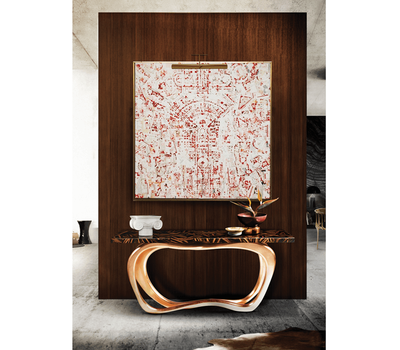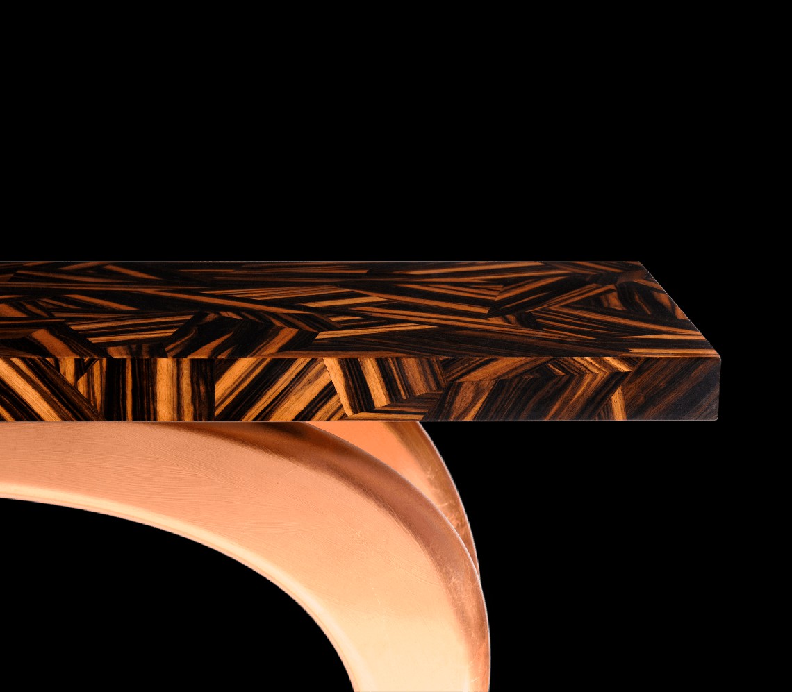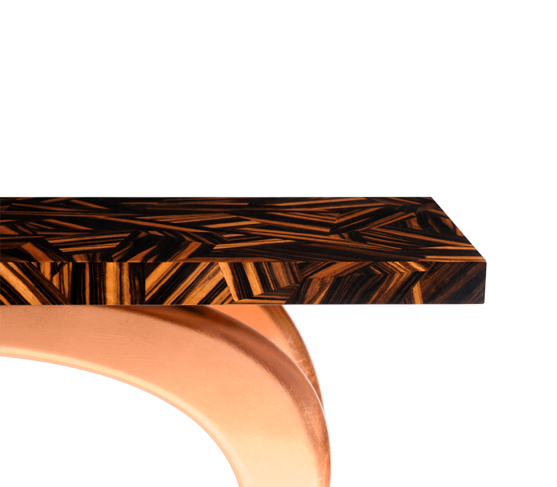 Boca do Lobo's furniture exhales style, grace and luxury and this is certainly the case for Infinity console, a fascinating and exclusive piece, proven to be impressive and eye-catching through its sinuous and elegant lines. Infinity holds a shimmering aura that gets a classy touch to any living space. Stunning in either modern or classic entrance halls and a great addition to any living room decoration. Handcrafted by our talented craftsmen, this prodigious piece has a striking geometric mosaic wood veneer top and a copper leaf base finished with high gloss varnish.
