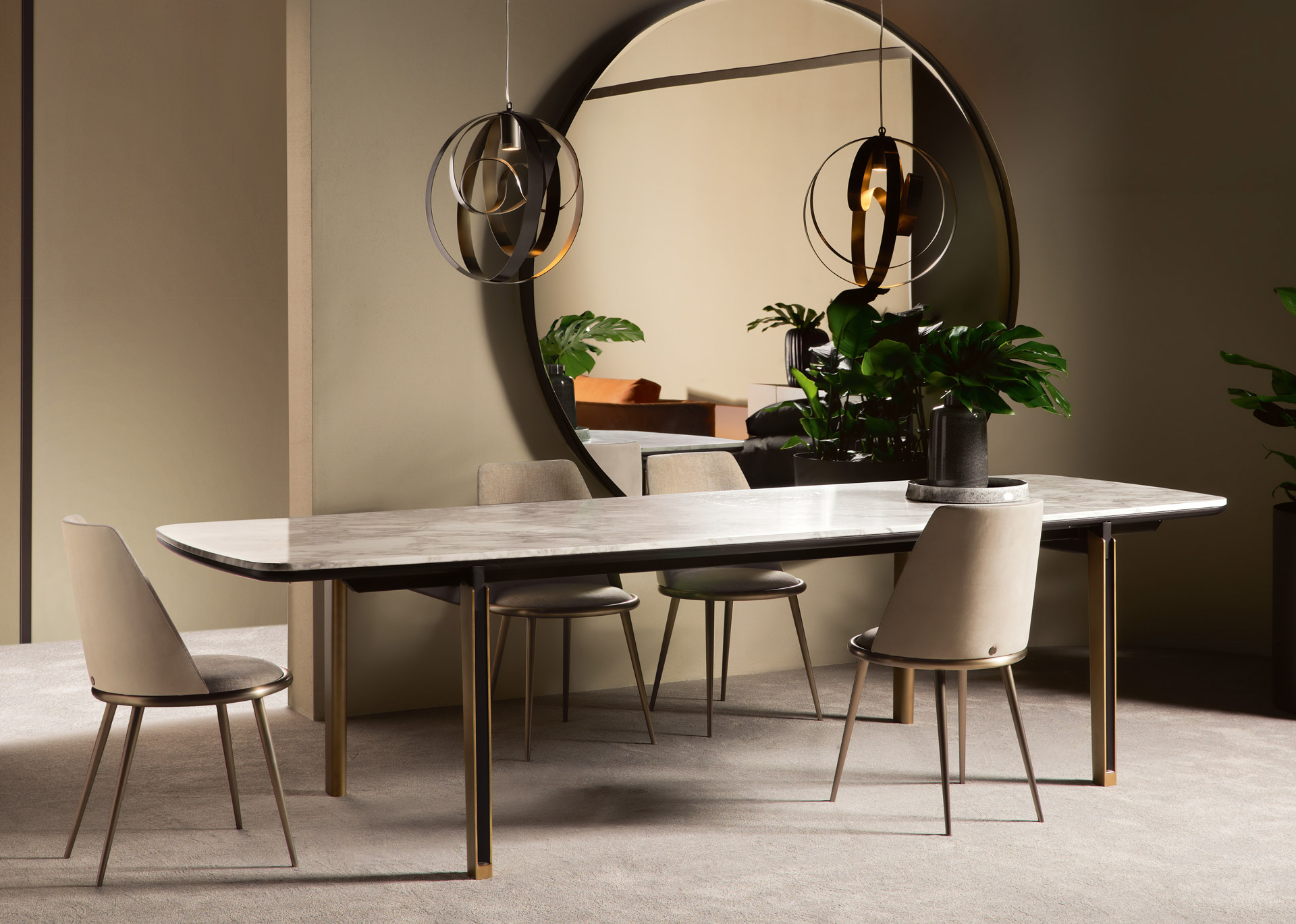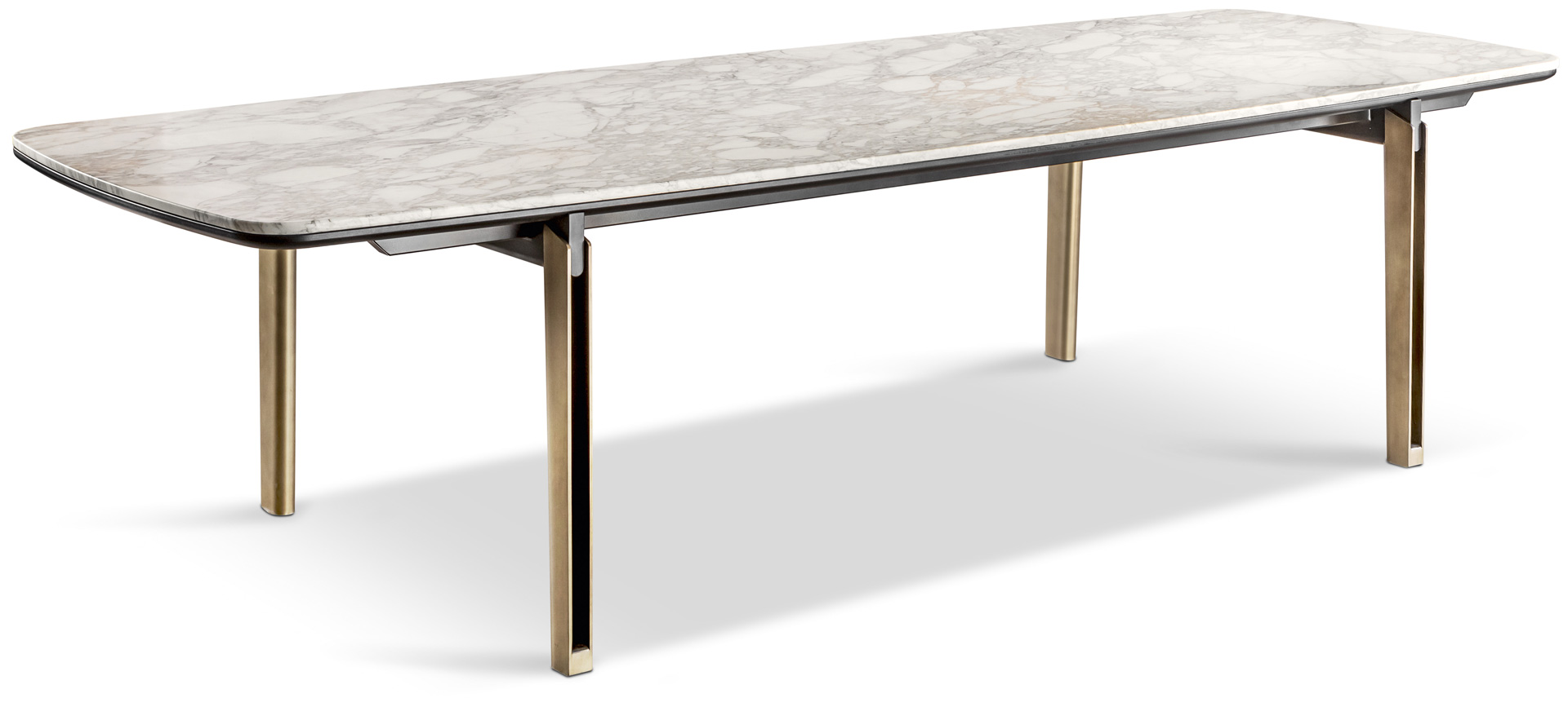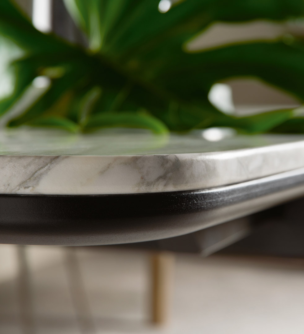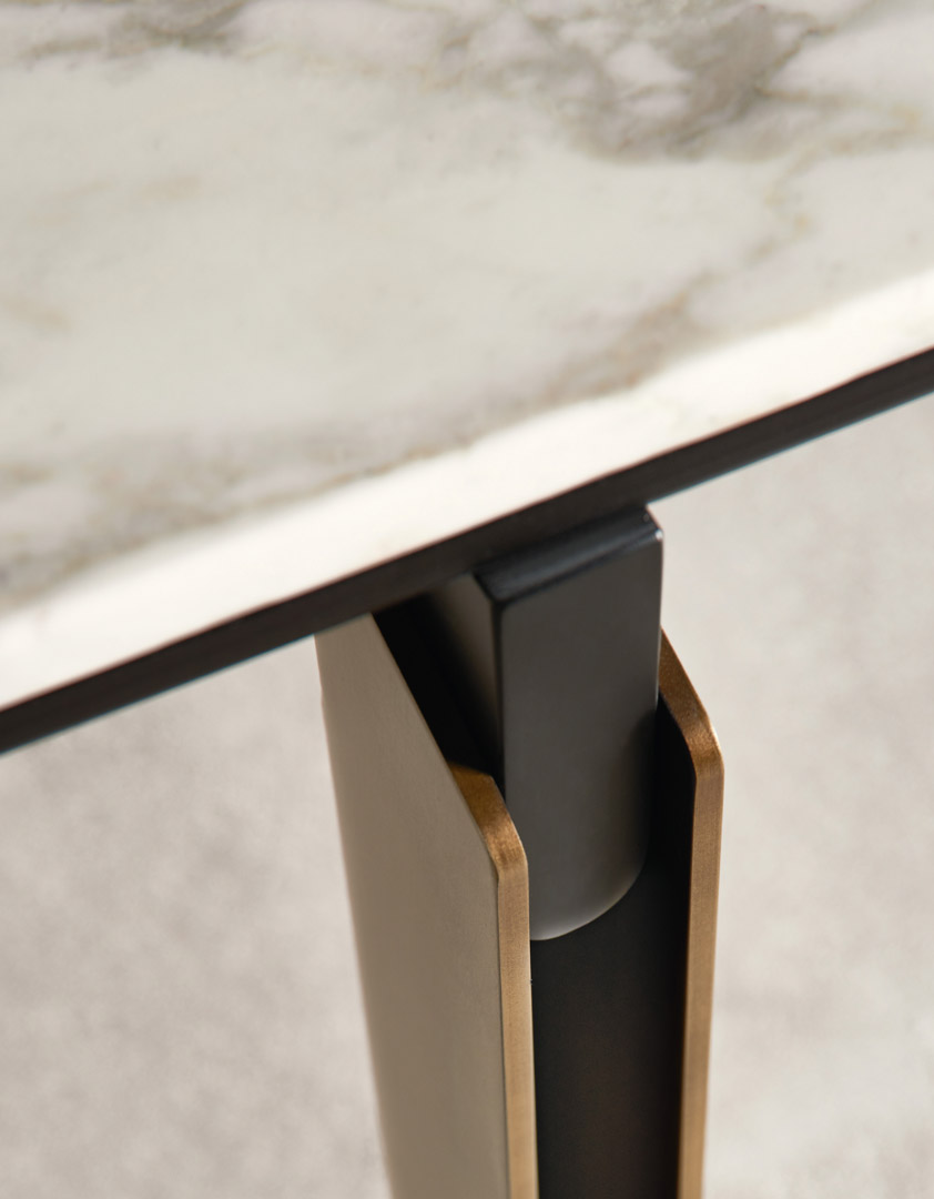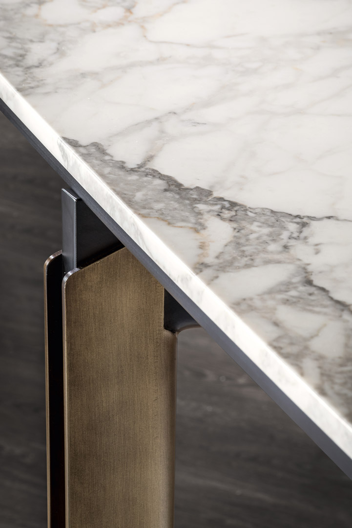 Le gambe sono in bronzo patinato, ottenute da un unico blocco di metallo scavato e ribattuto all’interno, che s’incastrano nella struttura proponendo un inedito e ricercato effetto decorativo. Il piano è in marmo calacatta, personalizzabile con differenti pietre o in legno. La sapiente unione tra legno, metallo e marmo rende il tavolo Mirage un oggetto dalla marcata personalità e dal design moderno e deciso.