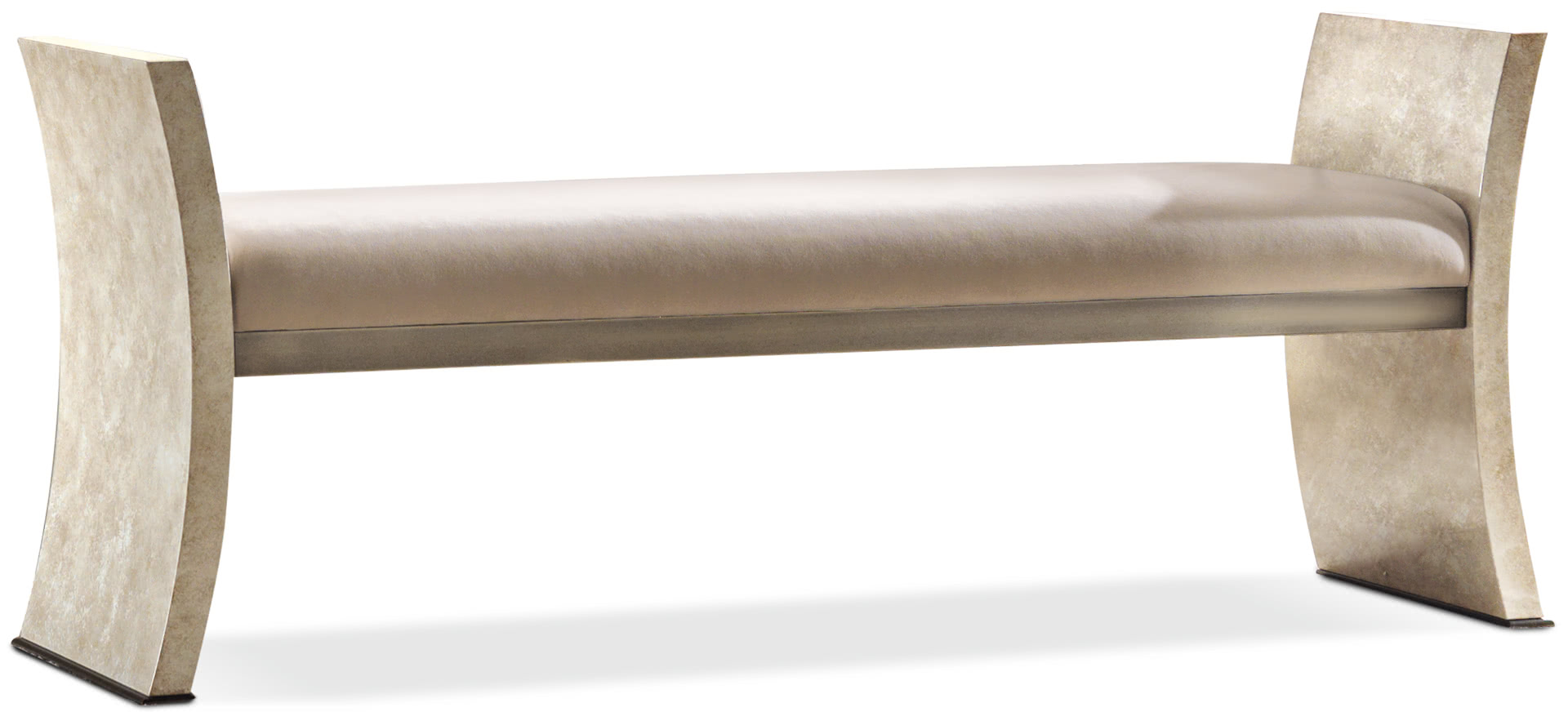 La struttura è in legno curvato mentre i piedi e la fascia sotto la seduta, sono in ferro con finitura a bagno di galvanica bronzo. La seduta, in ferro imbottita in gomma, è rivestita e trapuntata in velluto, tessuto, pelle o con un tessuto/pelle fornito dal cliente. Perfetta come fondo letto in camera.