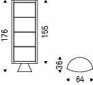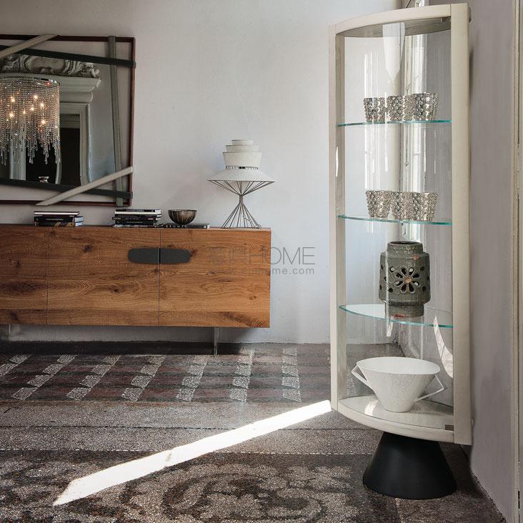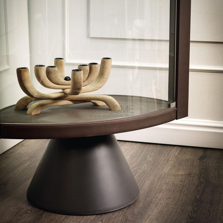 Swiveling extra clear glass showcase with Canaletto walnut (NC) frame or covered in soft leather as per sample card. Internal extra clear glass shelves. Base in graphite embossed lacquered steel (GFM69). LED light. Max capacity: each shelf kg 7.