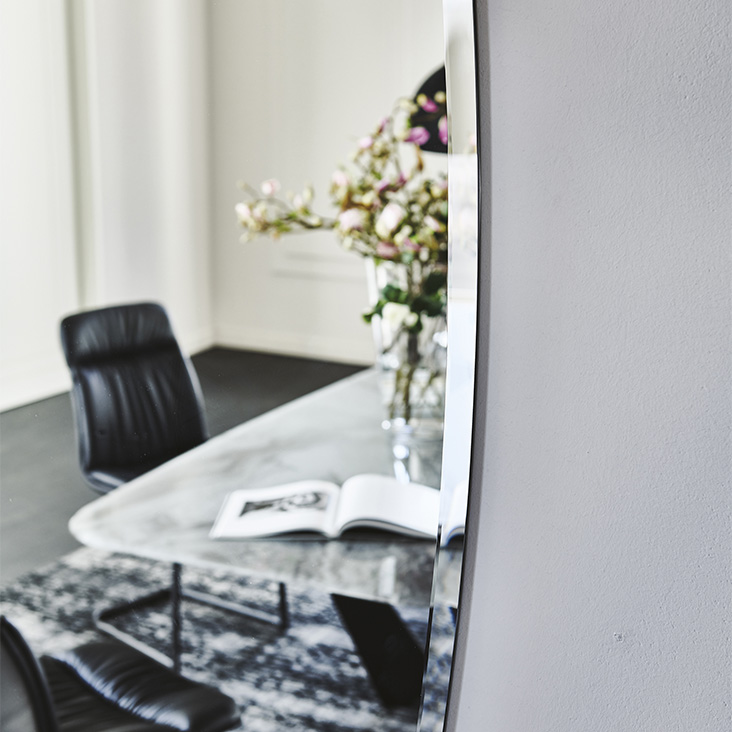 Wall mirror in mirrored, smoked grey or bronze mirrored glass with bevelled edges. Wall bracket with fixing possibilities in different positions.
