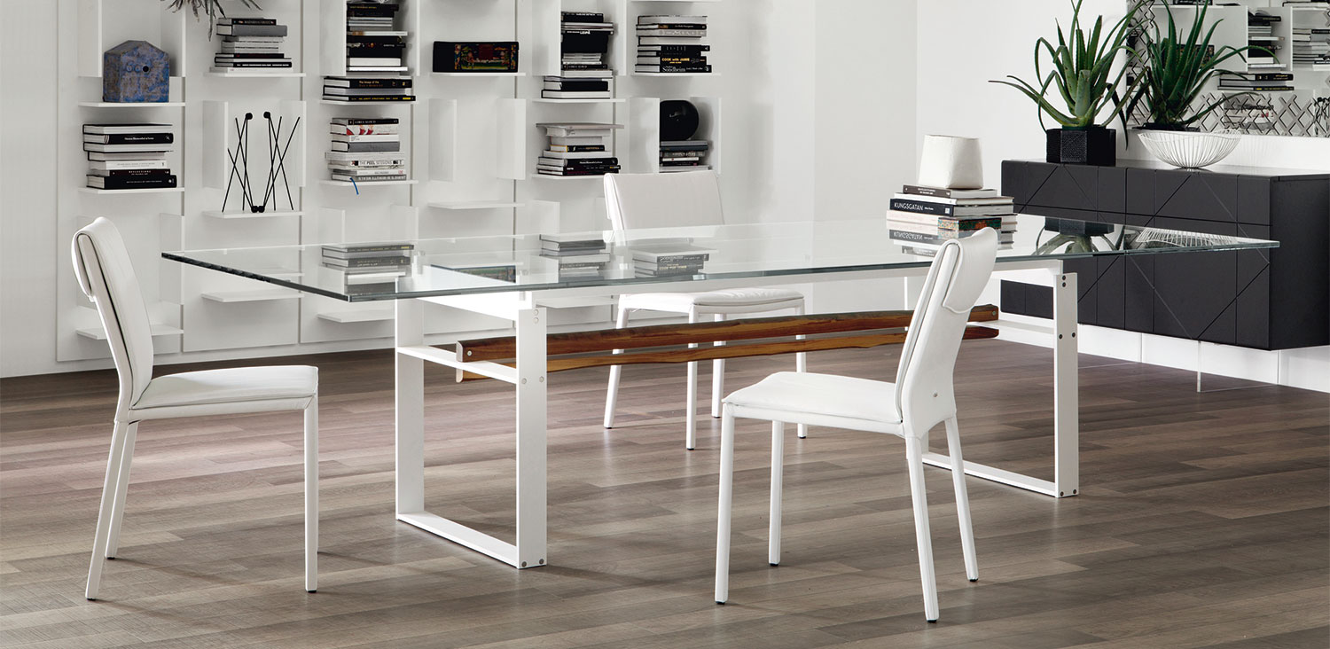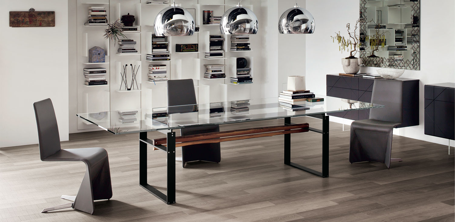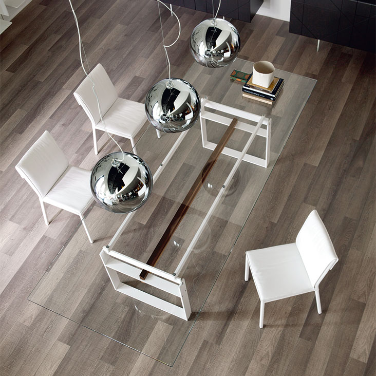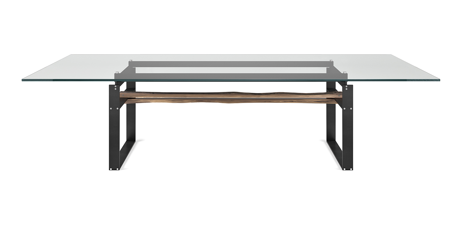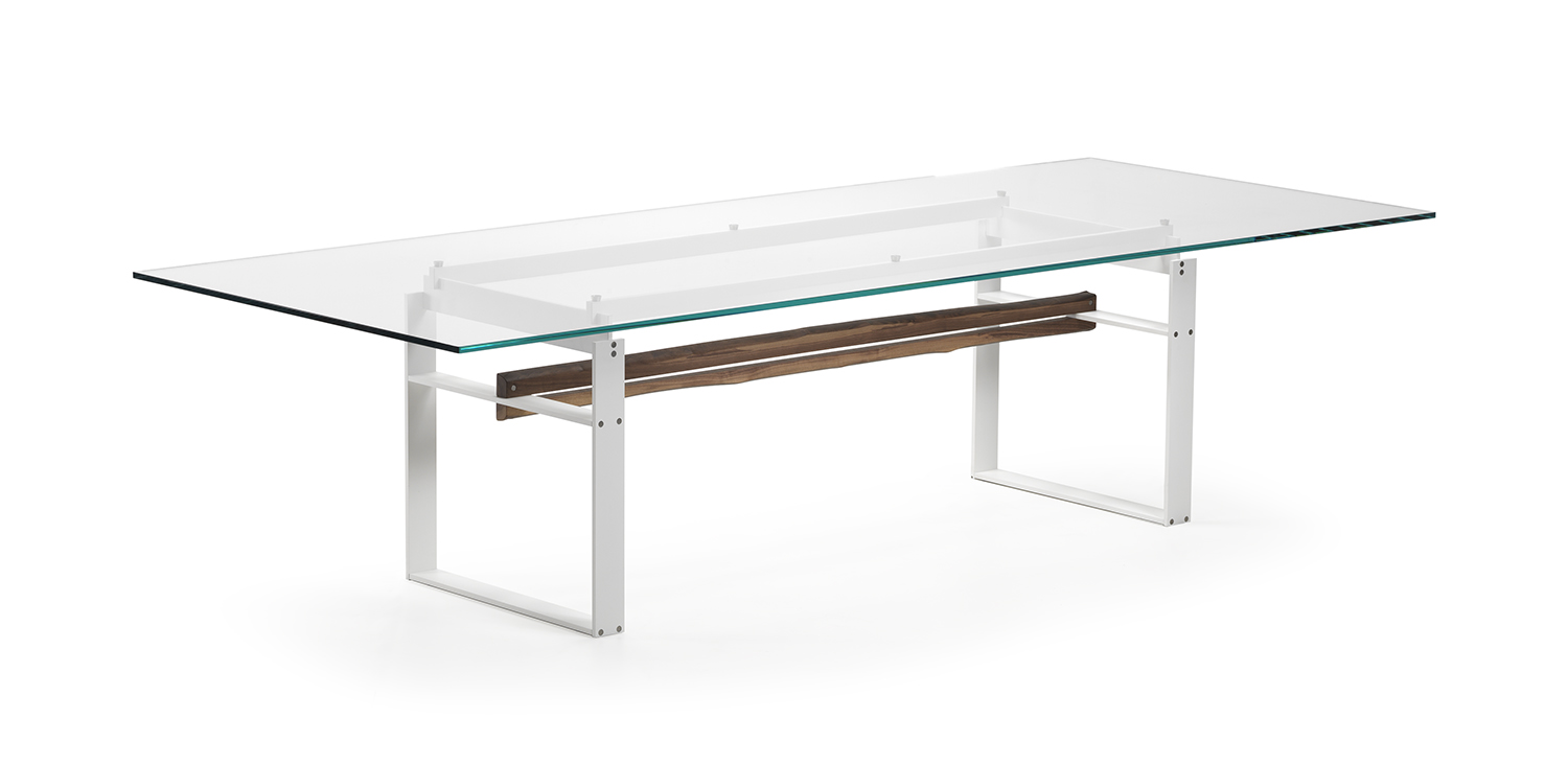 Table with base in graphite (GFM69), white (GFM71) or black (GFM73) embossed lacquered steel and central beam in natural solid Canaletto walnut (NC) or embossed graphite (GFM69), white (GFM71), black (GFM73) lacquered steel. Top in 15mm clear or extra clear glass. The top is laid on the base.