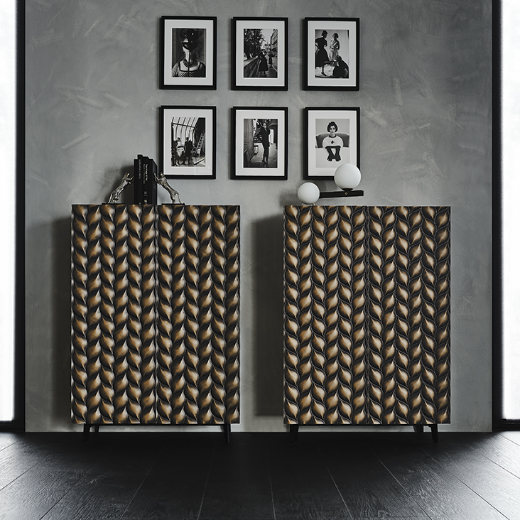 Sideboard in embossed graphite (GF69) or titanium (M11) lacquered wood, Brushed Bronze or Brushed Grey. Feet in graphite (GFM69) or black (GFM73) embossed lacquered steel. Partially mirrored inside and fumé glass shelves. Optional: internal led light kit.