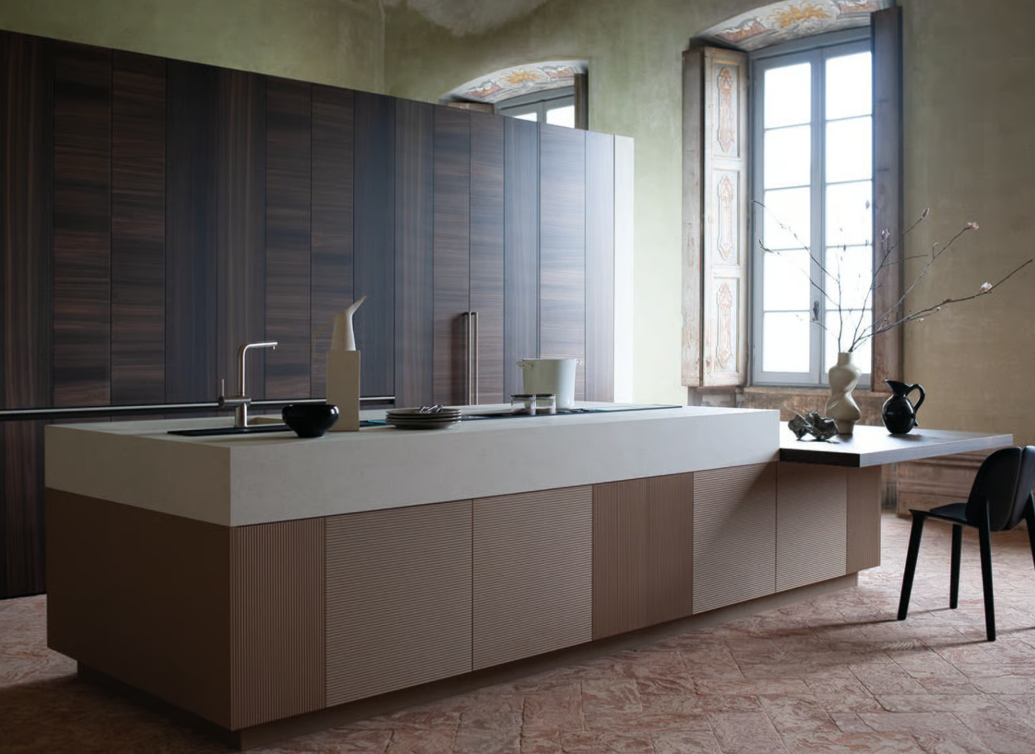 INTARSIO ISLAND with Snack Table.? Doors in structured Champagne lacquered Intarsio, worktop in MDi Ananda with integrated five-zone induction hob and touch controls on the surface.? Integrated matte black equipped channel and Snack table in bonded Eucalipto veneer.?