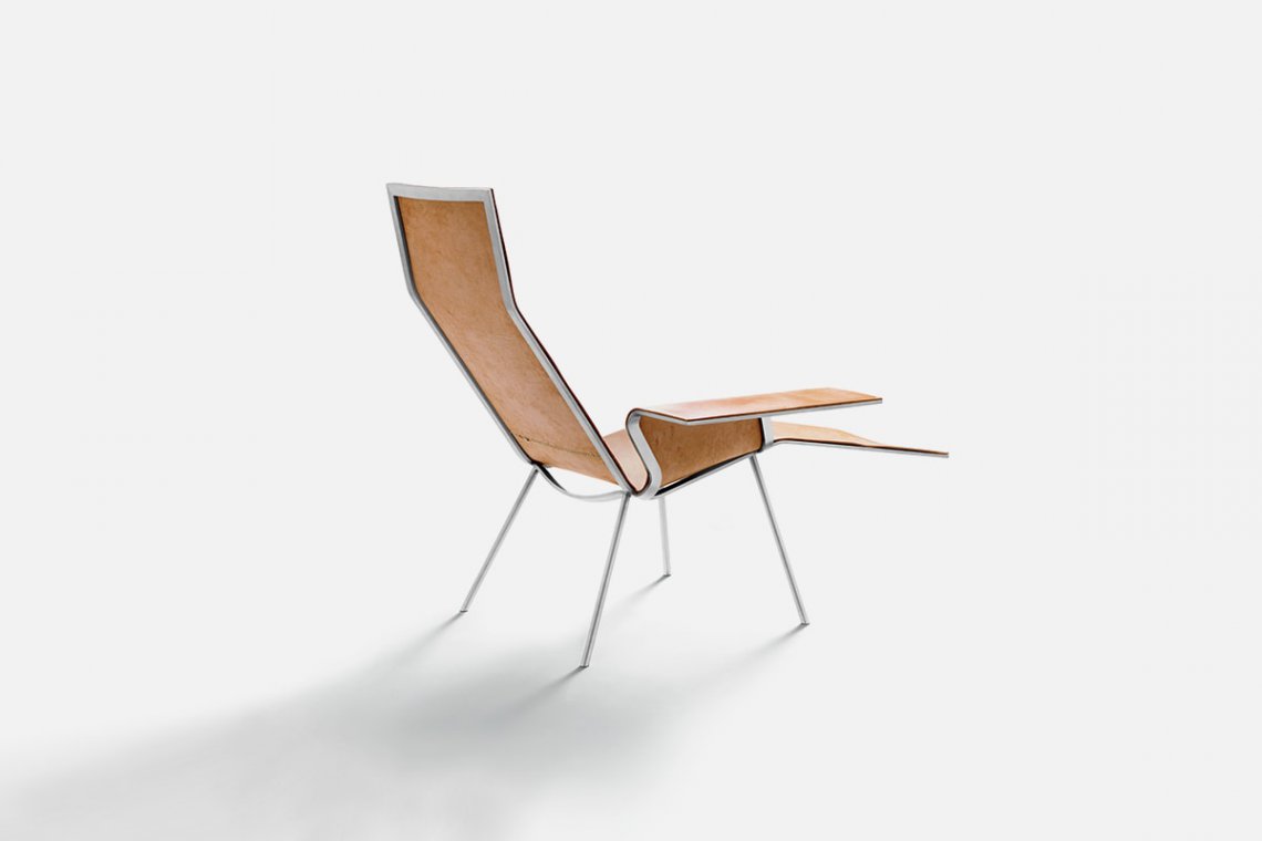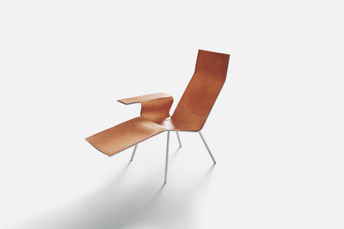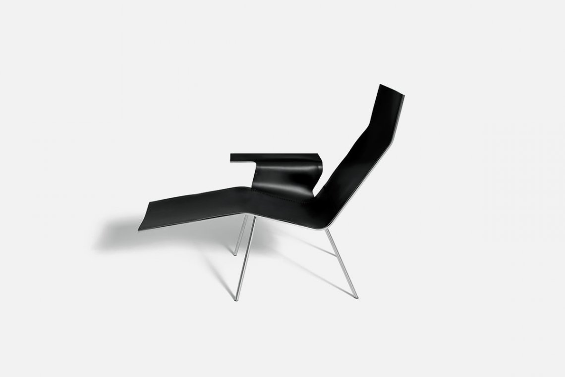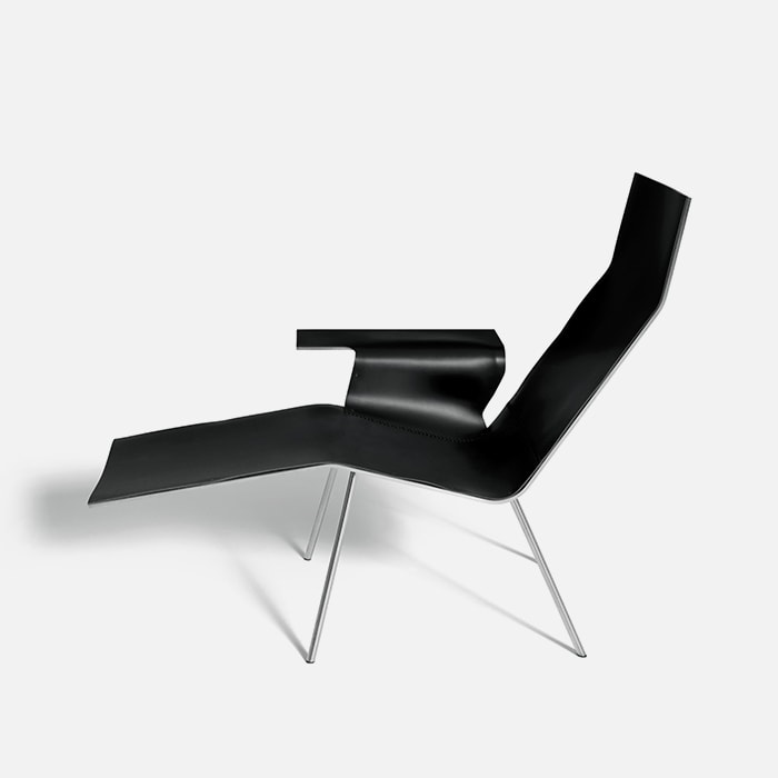 The sleek line of the Maarten Van Severen chaise longue is inspired by traditional Nordic design, just as the hand-stitched seams are the sign of painstaking all-Italian artisan crafting. The project, with simple lines and a comfortable shape, comes in two versions: tan or black full-grain leather that is hand-stitched and attached with stainless steel screws.