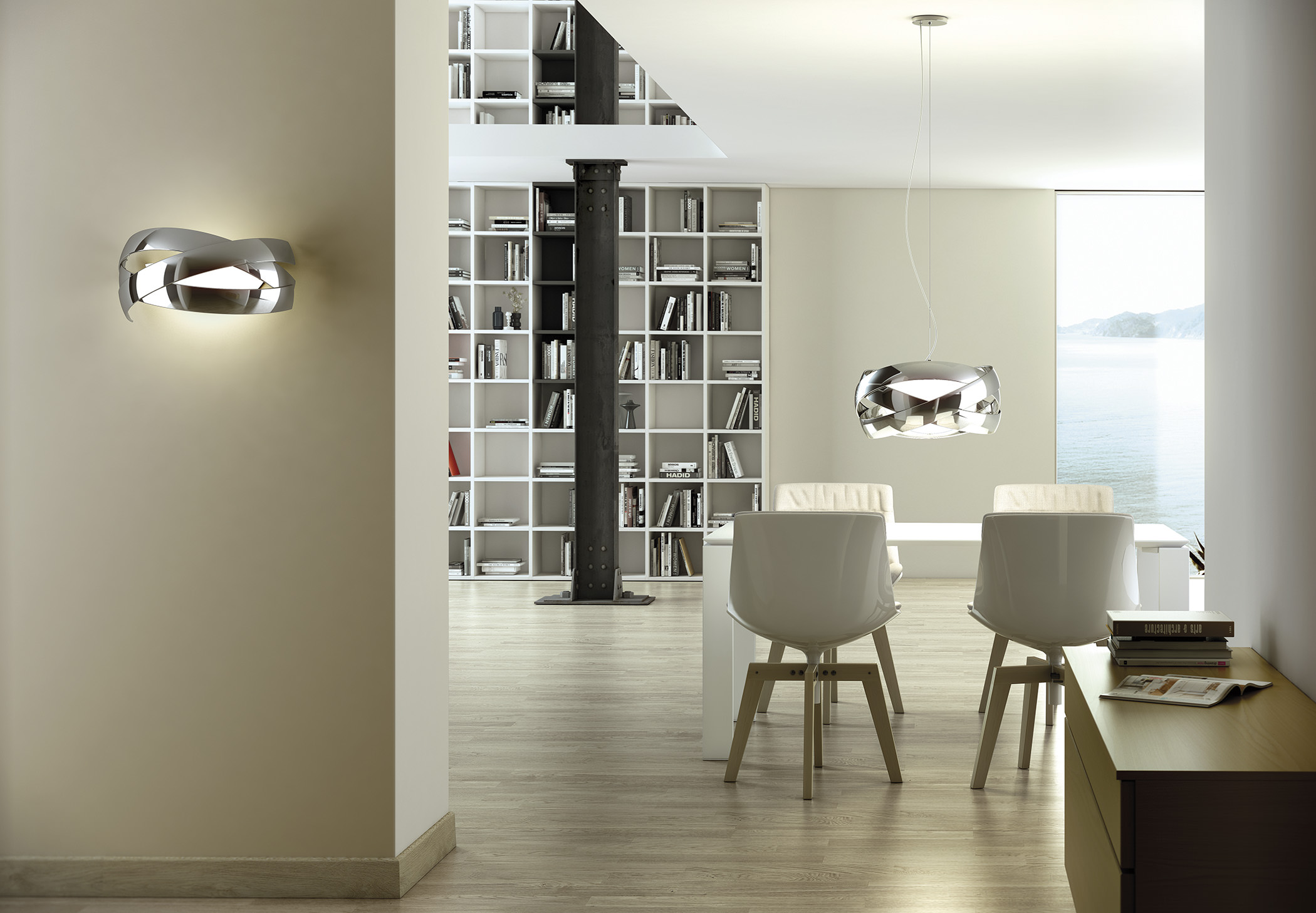 Wall lamp providing direct and indirect light. Shade is made of a satinated glass and decorative aluminium rings.