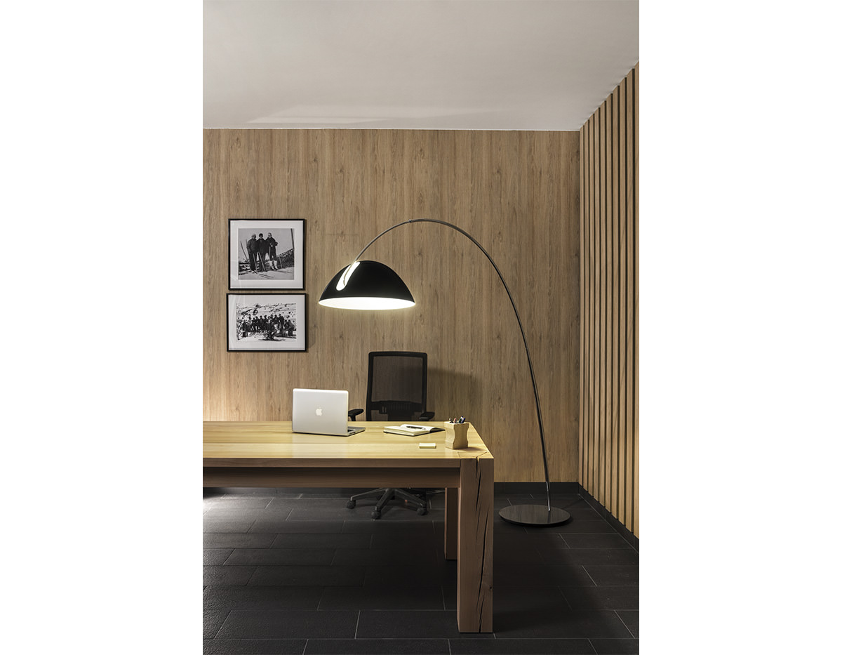 Metallic arc lamp with acrylic shade and extensible swing arm. Optional bottom methacrylate diffuser. Cord dimmer.