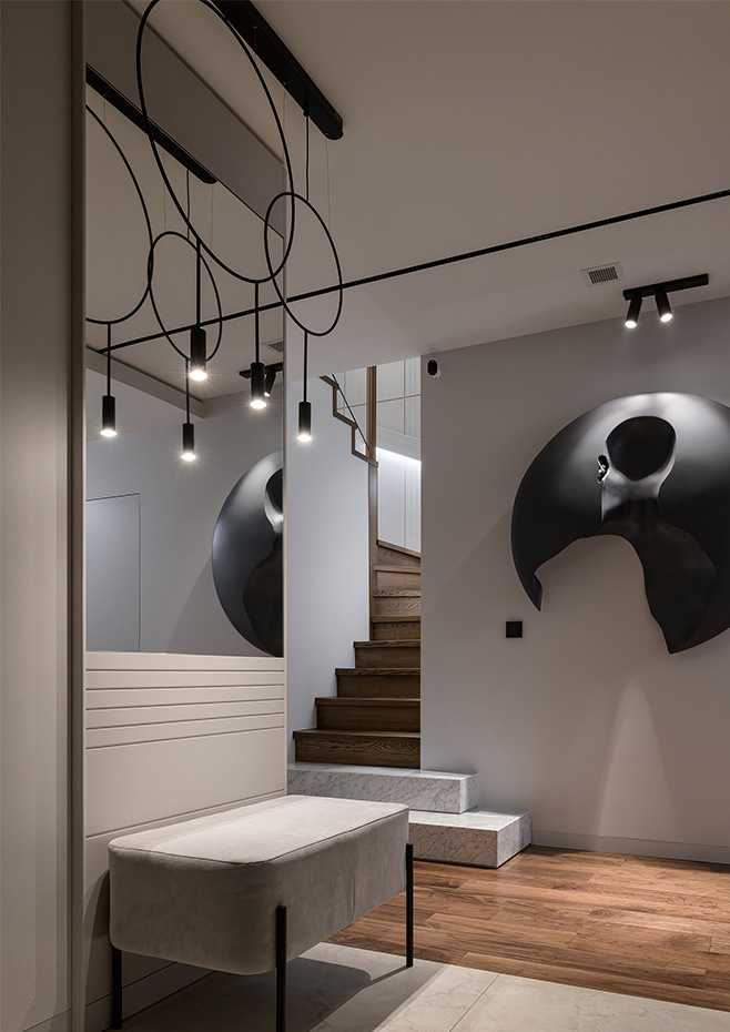 Cylindrical aluminium heads and acrylic (PMMA) lens diffusers. Adjustable height. Optional decorative sound absorbing panel.