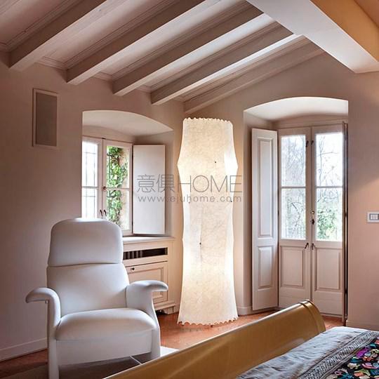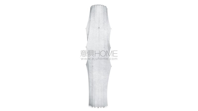 Floor lamp providing diffused light. White powder coated internal steel structure sprayed with a unique "cocoon" resin to create the diffuser which is then protected by a transparent sprayed on finish. On the cable there is the electronic dimmer which allows the regulation of light brightness.