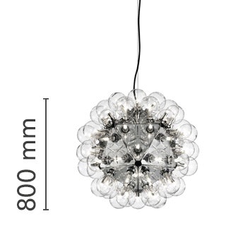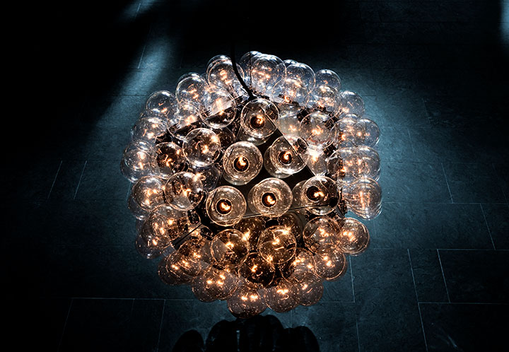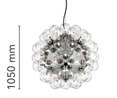 Suspension fixture providing direct and reflected lighting. Structure formed by 20 pressed, polished aluminum triangles. 120 clear Globolux lamps housed around the structure. Steel ceiling fitting and rose.
